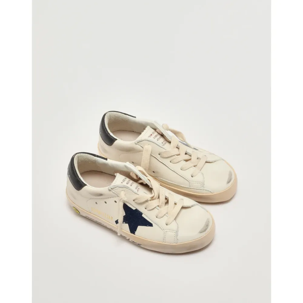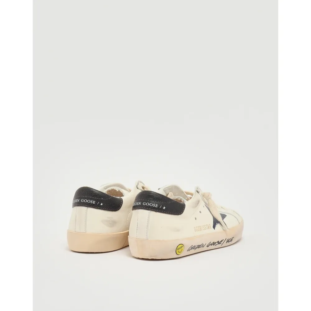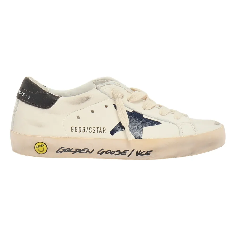 Die Golden Goose Super-Star Young Sneakers kombinieren ein Obermaterial aus Nappaleder mit dem markentypischen Vintage-Look. Der aufgedruckte Stern und der kontrastierende Fersenbereich sorgen für einen unverwechselbaren, lässigen Alltagslook. Hauptmerkmale: Weiß | Blau | Nappaleder | Schnürverschluss | Gummisohle | Handgefertigte Konstruktion | Aufgedrucktes Sterndetail | Kontrastierender Fersenbereich | Smiley und Schriftzug auf dem Foxing | Abgenutztes / Vintage-Finish | Runde Zehenpartie | Maße & Passform: Normale Passform | Fällt größengerecht aus | Material & Pflege: Obermaterial: 94% Schafsleder, 6% Rindsleder | Futter: 44% Baumwolle, 43% Rindsleder, 8% Polyester, 5% textiles Polyurethan | Sohle: 100% Gummi