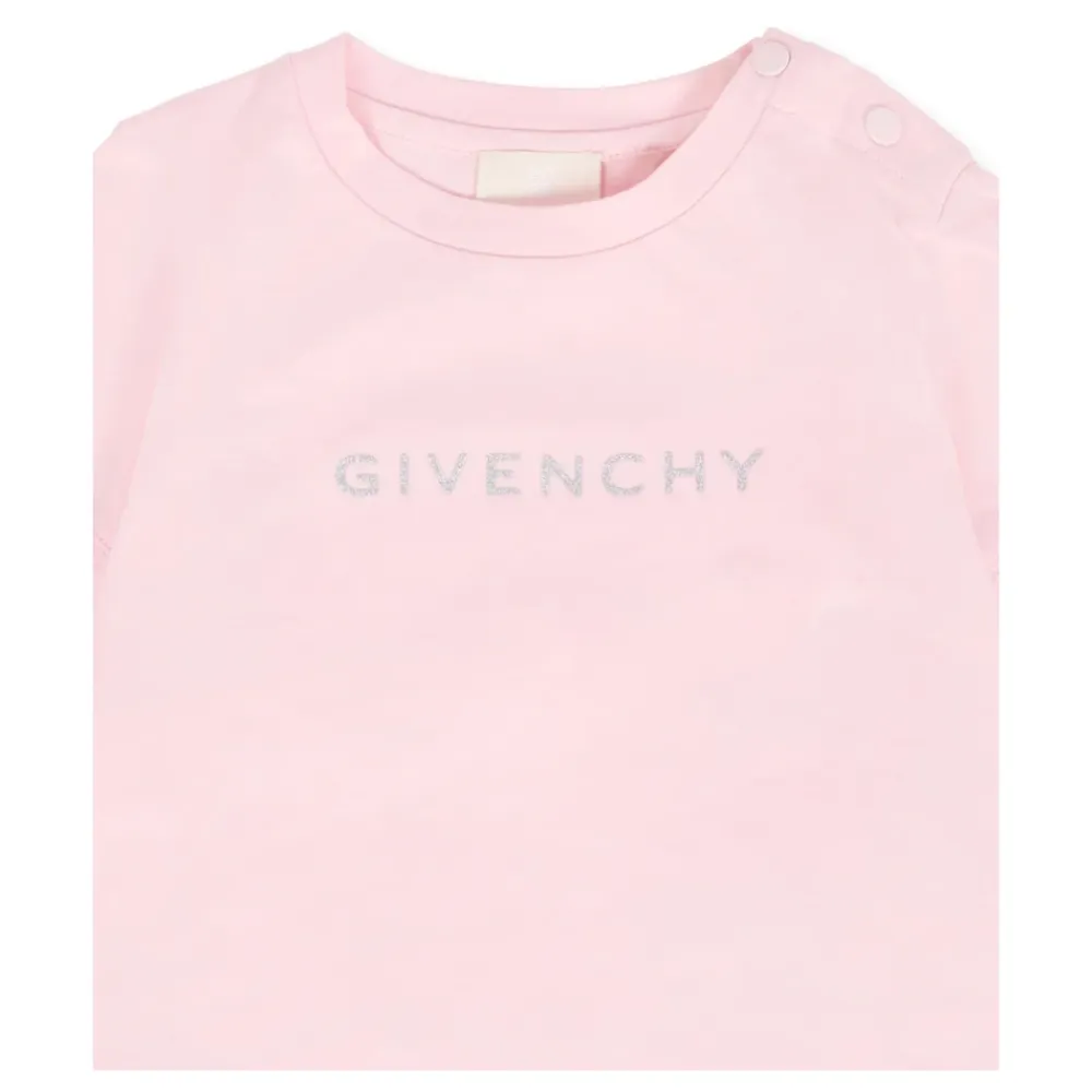 Verleihen Sie der Garderobe Ihres kleinen Lieblings mit diesem rosa Givenchy Kids T-Shirt einen Hauch von Luxus. Hergestellt aus Bio-Baumwolle, verfügt es über einen gerippten Rundhalsausschnitt, kurze Ärmel mit Rüschen und Druckknopfverschluss auf der Schulter. Verziert mit einem Lurex-Logo auf der Vorderseite und dem ikonischen 4G-Motiv auf der Rückseite. Details: 100% Bio-Baumwolle. Bei 30°C waschen.