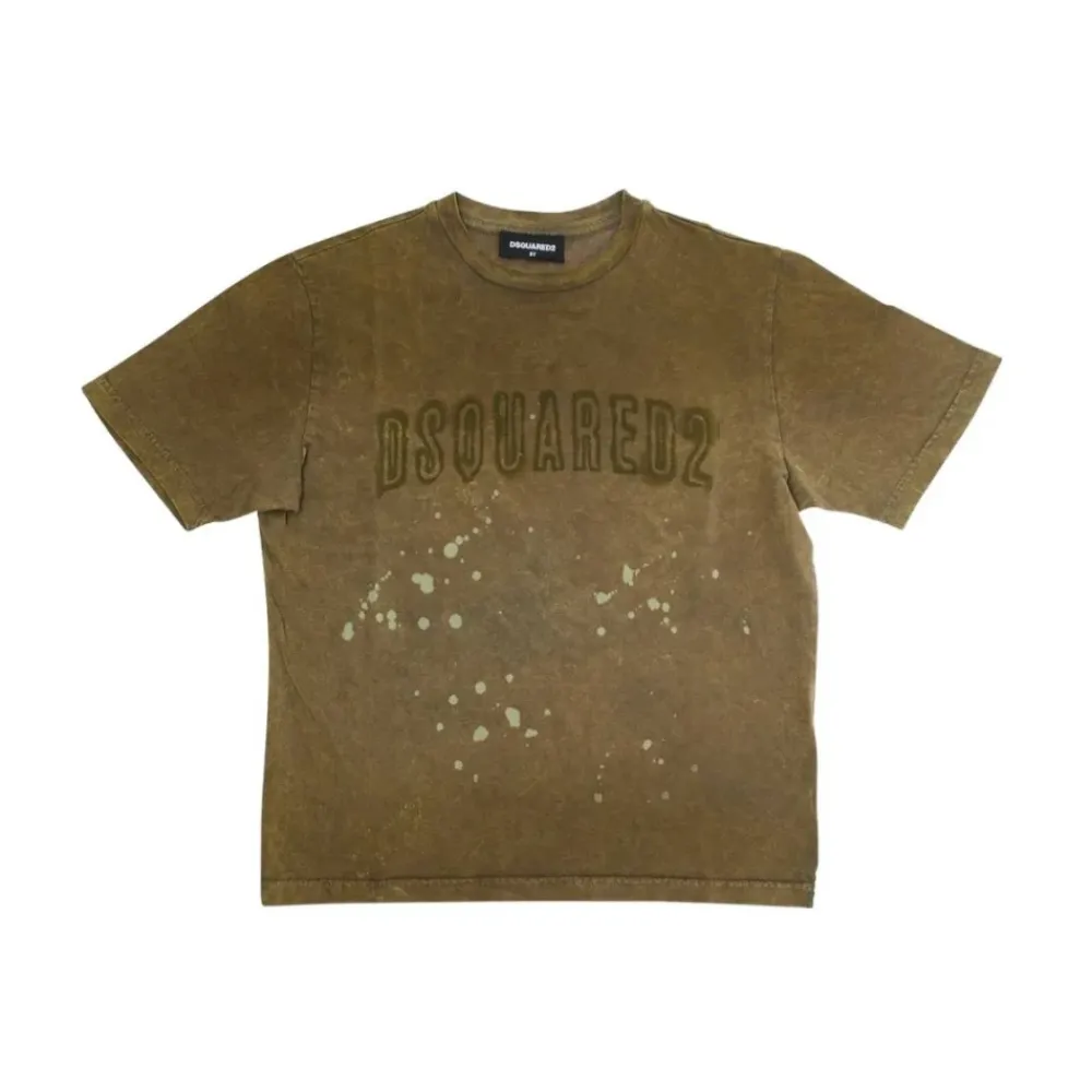 Dsquared2 T-Shirt mit Used-Effekt-Logo: ein Baumwoll-T-Shirt mit einem abgenutzten Logo und Farbspritzer-Details für einen lässigen, eingetragenen Look. Hauptmerkmale: Grün | Baumwolle | Used-Effekt-Logo | Farbspritzer-/Fleckendetails | Zusammensetzung und Pflege: 100 % Baumwolle