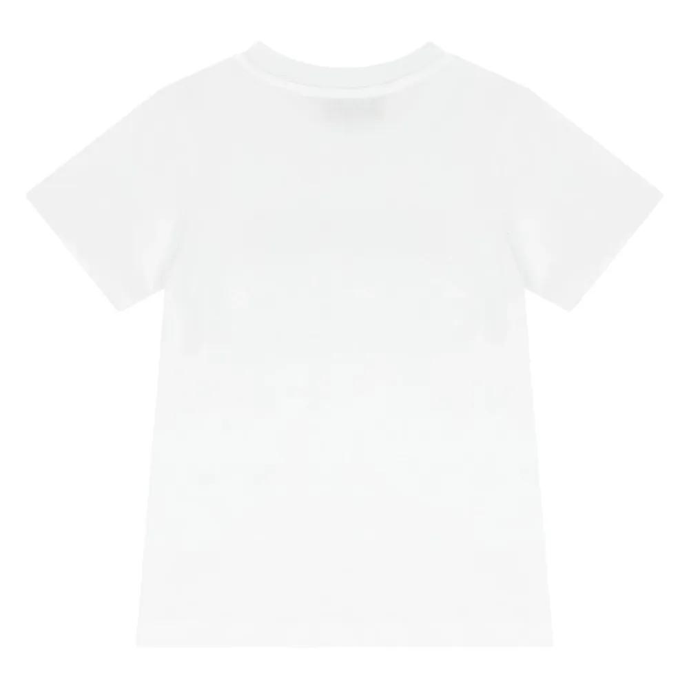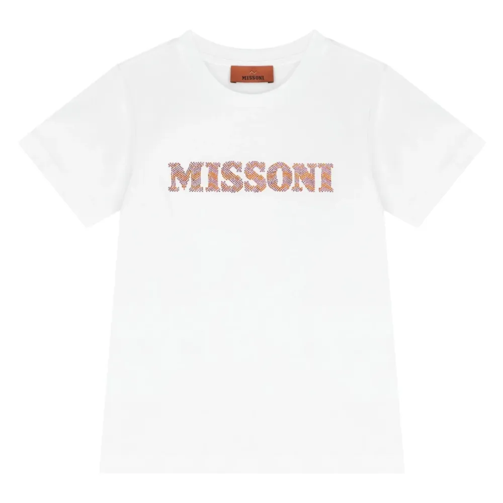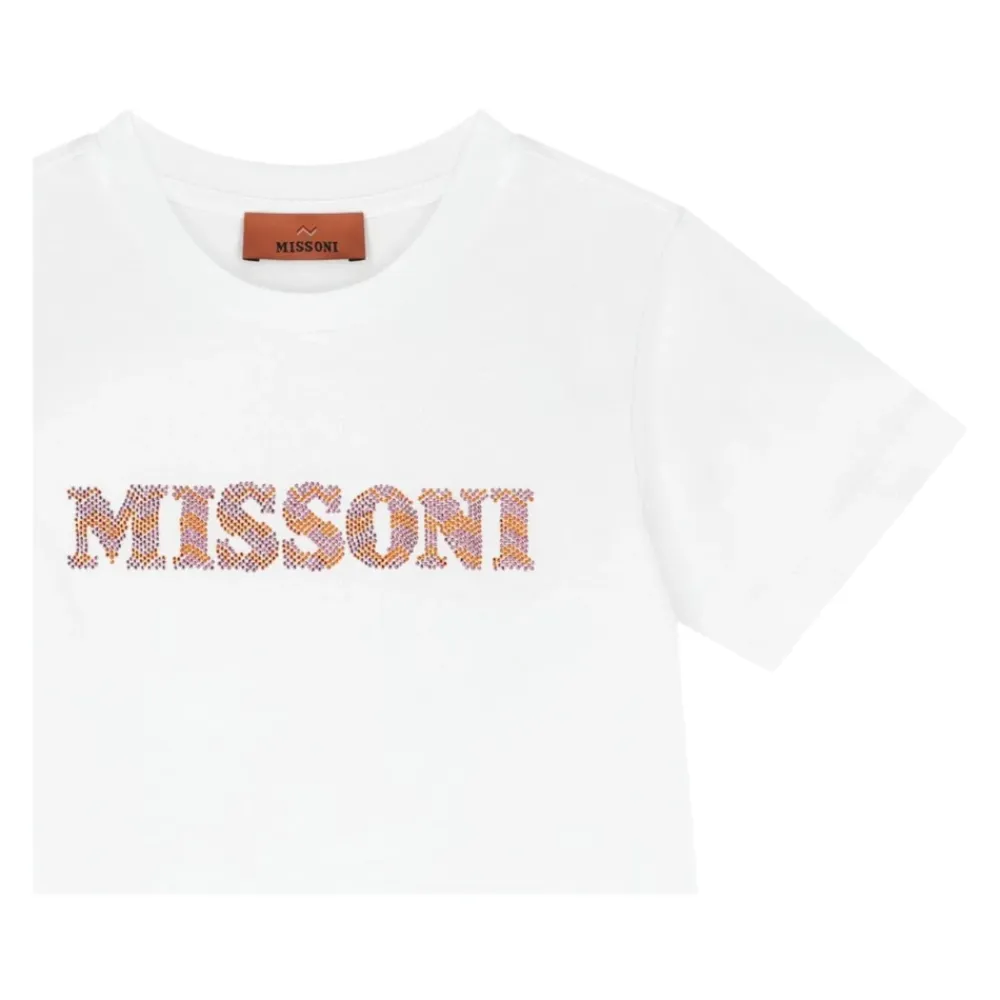 Missoni T-Shirt mit einem kontrastierenden, mehrfarbigen Strass-Logo, entworfen für den täglichen Gebrauch mit Rundhalsausschnitt und kurzen Ärmeln. Hauptmerkmale: Weiß | Baumwolle | Rundhalsausschnitt | Kurze Ärmel | Kontrastierendes, mehrfarbiges Strass-Logo | Gerader Saum | Maße & Passform: Reguläre Passform | Material & Pflege: 100% Baumwolle