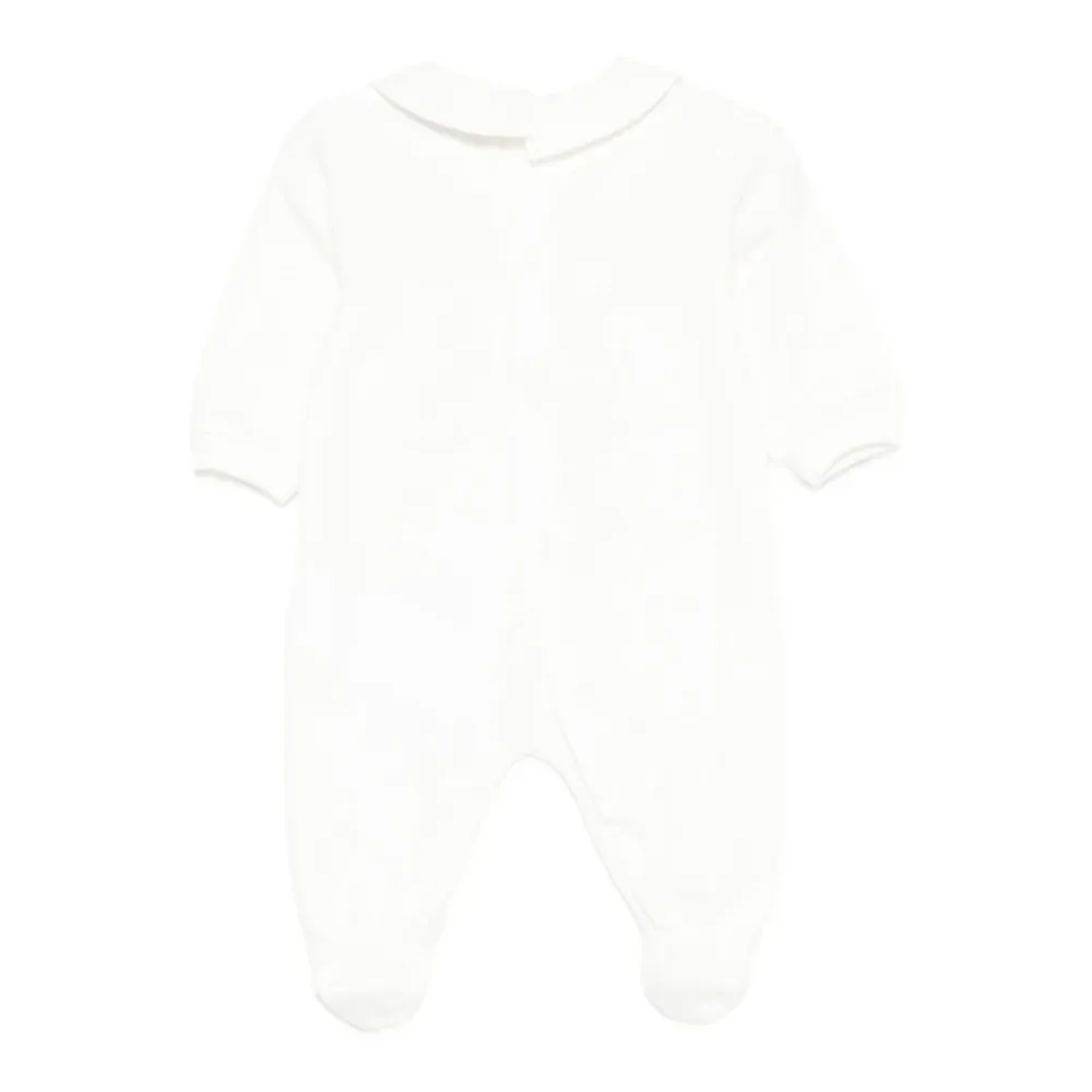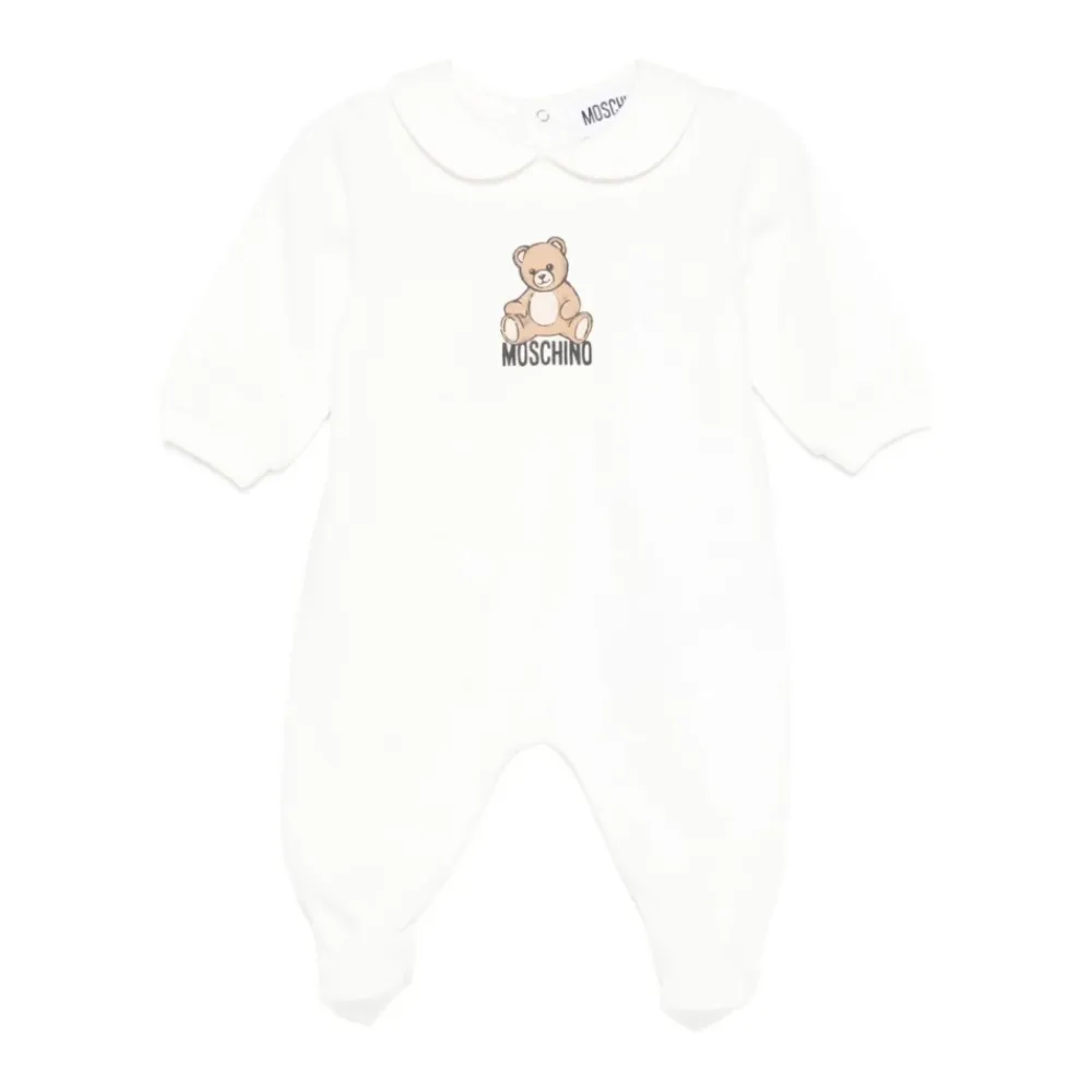 Der Moschino Teddy Print Romper kombiniert weichen 100% Baumwollkomfort mit einem verspielten Teddybären-Print und einem klassischen Peter-Pan-Kragen. Druckknopfverschluss und Füße sorgen für schnelles und bequemes Anziehen. Hauptmerkmale: Weiß | Baumwolle | Druckknopfverschluss | Füße | Elastische Rippbündchen | Peter-Pan-Kragen | Lange Ärmel | Teddybären-Print | Zusammensetzung & Pflege: 100% Baumwolle