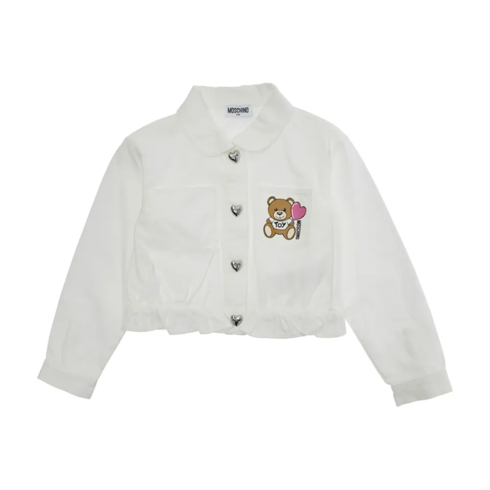 Heben Sie den Stil Ihres kleinen Mädchens mit dieser weißen Baumwolljacke von Moschino hervor, die einen niedlichen Teddybärendruck auf der Vorderseite hat. Perfekt für modische junge Damen!