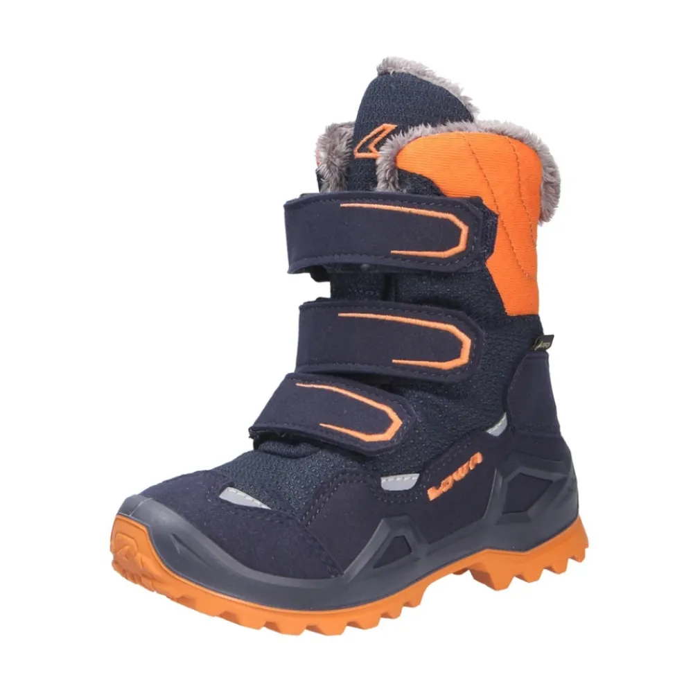 Robuste Winterstiefel für Jungen der Marke Lowa aus feinem hochwertigem Synthetikmaterial. Innen ist der Schuh mit weicher und warmer Wolle gefüttert. Die weich gepolsterte textile Einlegesohle ist austauschbar und bietet Platz für eigene Einlagen. Entwickelt nach dem WMS-Weitensystem, hat der Schuh eine WMS-Weite M, was eine optimale Passform für ‚kleine‘ Füße garantiert. Der durchgehend flache Absatz und die griffige, abriebfeste Gummisohle sorgen für Stabilität. Ein Klettverschluss für einfaches An- und Ausziehen gewährleistet einen guten Halt. Der Schuh ermöglicht eine stufenlose Anpassung an den Fuß und die mittlere Schaftweite passt sehr gut für alle normalen Waden. Durch die runde Schuhspitze wirkt der Schuh dezent am Fuß und bietet ausreichend Platz für die Zehen. Die Schuhgröße fällt regulär aus. Die verwendete GORE-TEX® Membran ist bekannt für dauerhaften, bequemen und zuverlässigen Wetterschutz.