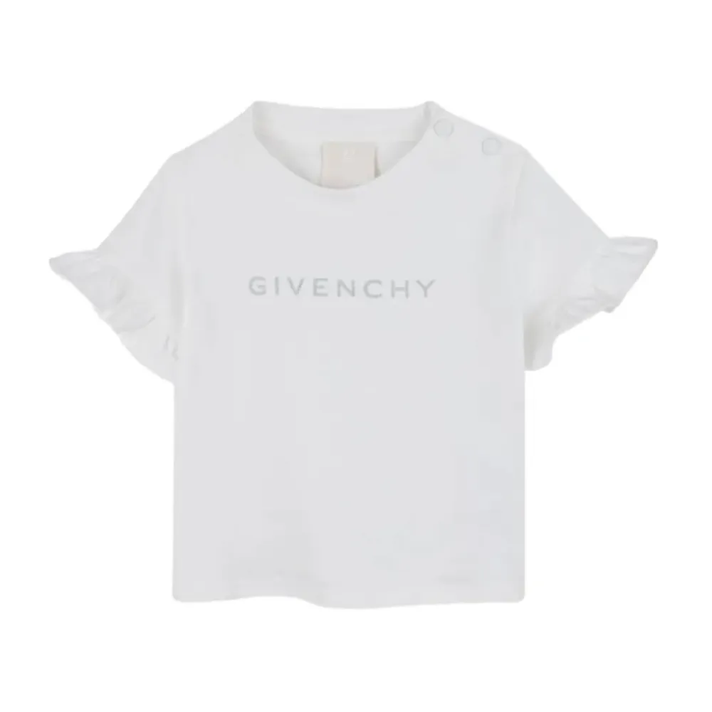 Das Givenchy Younger T-Shirt kombiniert einen auffälligen Logoprint mit gerüschten Ärmelbündchen und praktischen Druckknöpfen an der Schulter für einfaches Anziehen. Der Stil vereint das charakteristische Branding mit alltäglichem Komfort. Hauptmerkmale: Weiß | Baumwolle | Weicher Baumwolljersey | Maschinenwaschbar | Druckknopfverschlüsse an der Schulter für einfaches Anziehen | Runder Halsausschnitt | Gerüschte Ärmelbündchen | Logoprint auf der Vorderseite | 4G-Logo auf der Rückseite | Zusammensetzung und Pflege: 100 % Baumwolle | Maschinenwäsche 30 °C, Schonwaschgang.