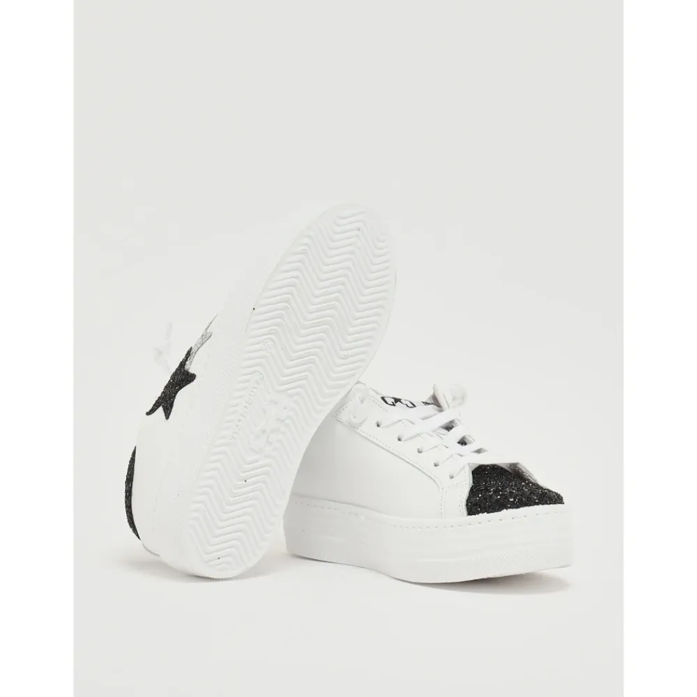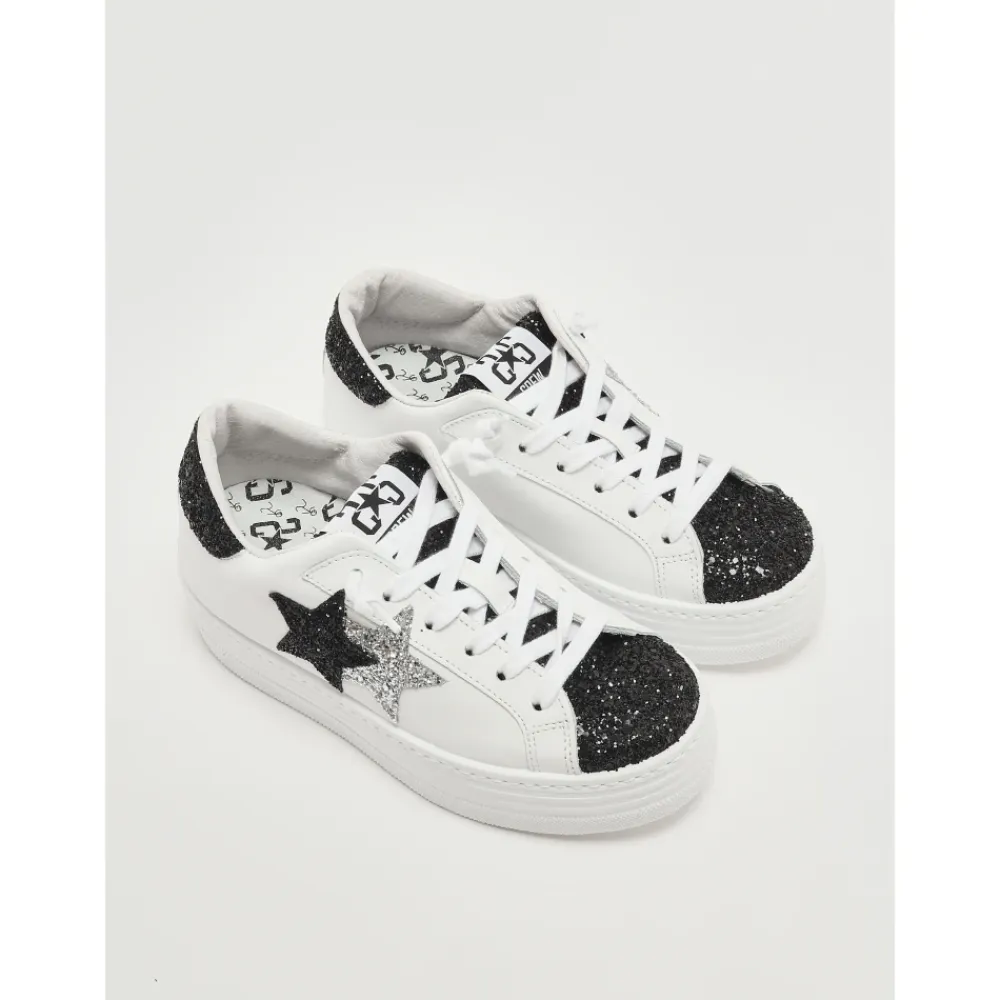Die 2STAR 2SB3370 Sneakers kombinieren eine klobige Plateausohle mit schwarzen und silbernen Glitzerakzenten für einen auffälligen Alltagslook. Sie verfügen über einen sicheren Schnürverschluss und eine abgerundete Spitze für bequemen Tragekomfort. Hauptmerkmale: Weiß | Schwarz | Silber | Leder | Schnürverschluss | Runde Spitze | Plateausohle | Kontrastierende Fersenkappe | Paillettendetails | Logo-Applikation | Maße & Passform: Fällt größengerecht aus | Materialzusammensetzung & Pflege: 100% Leder