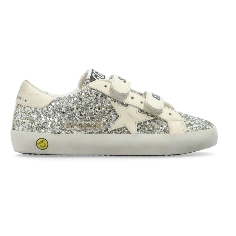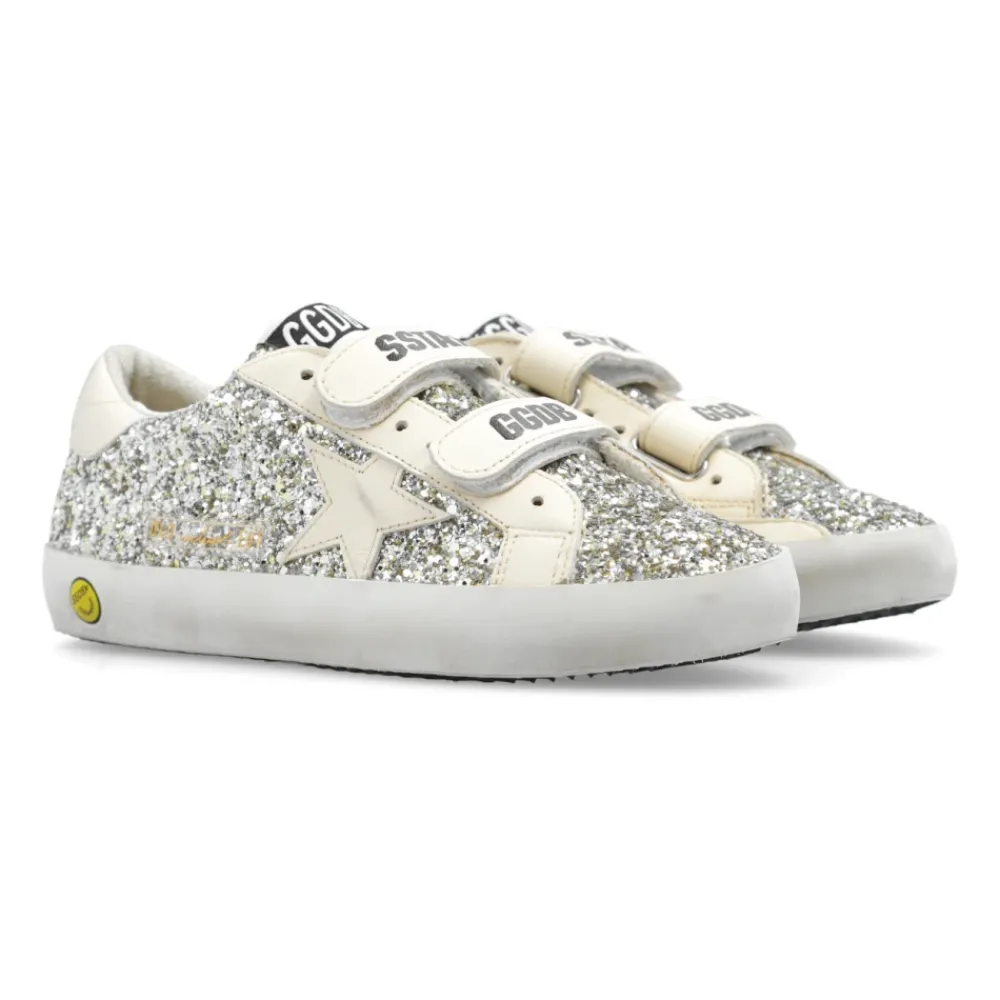 Sneaker im ‚Old School‘-Stil von Golden Goose Kids. Aus Leder gefertigt und mit silbernen Glitzer verziert, sitzt dieses Modell auf einer schwarzen und cremefarbenen Gummisohle und zeigt ein bedrucktes Logo, ein Logo-Patch, ein charakteristisches Sternen-Patch, abgenutzte Details und Klettverschlüsse. Sohlenhöhe: 2cm Kunden haben berichtet, dass diese Marke eher groß ausfällt. Wir empfehlen, eine Nummer kleiner als Ihre übliche Größe zu wählen.