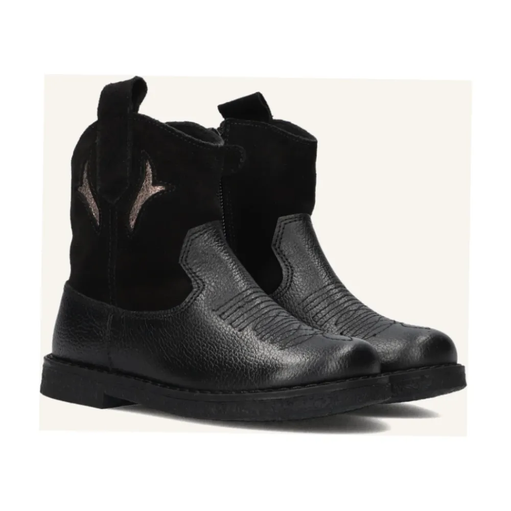 Apples & Pears B0012706 Stiefeletten kombinieren Leder und Wildleder mit Western-inspirierten silbernen Details für den Alltag. Sie bieten einfaches An- und Ausziehen mit einem seitlichen Reißverschluss und eine Gummisohle für zuverlässigen Halt. Hauptmerkmale: Schwarz | Zwart | Leder und Wildleder | Gummisohle für zusätzlichen Halt | Entwickelt für ganztägigen Komfort | Seitlicher Reißverschluss für einfaches An- und Ausziehen | Silberne Details und Steppnähte im Western-Stil | Runde Zehenpartie | Abmessungen & Passform: Bequeme Passform | Zusammensetzung & Pflege: Leder | Wildleder | Textilfutter | Gummisohle