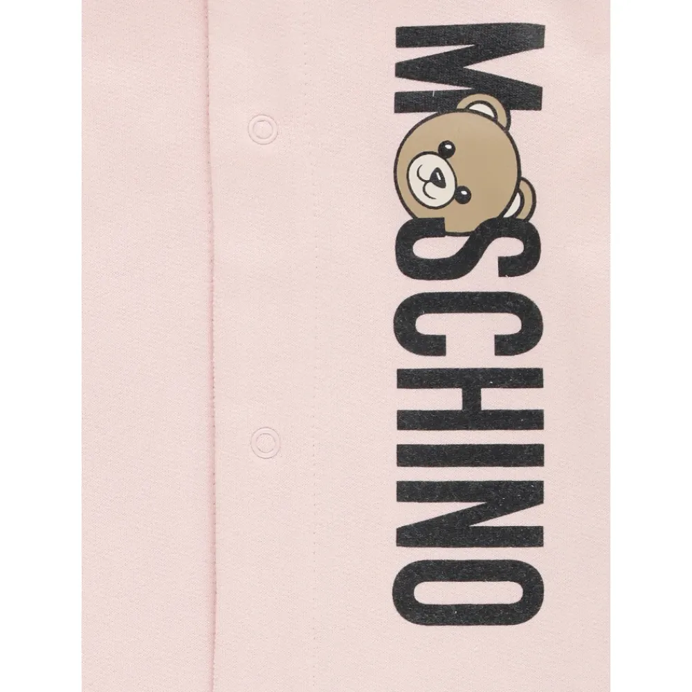 Kleide deinen kleinen Jungen stilvoll in diesem rosa Moschino Baby Baumwoll-Overall. Mit kontrastierendem Kragen, langen Ärmeln, Knopfverschluss vorne und einem Logo-Druck in kontrastierender Farbe vorne.