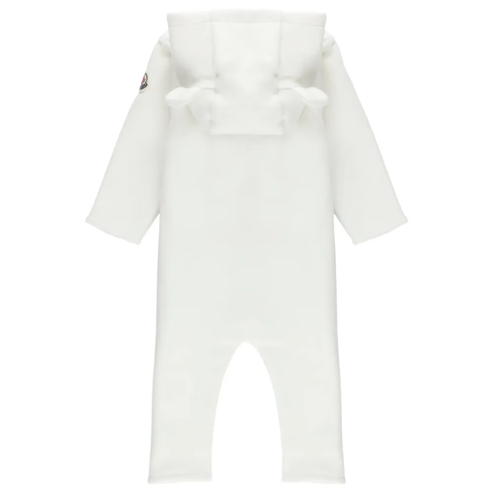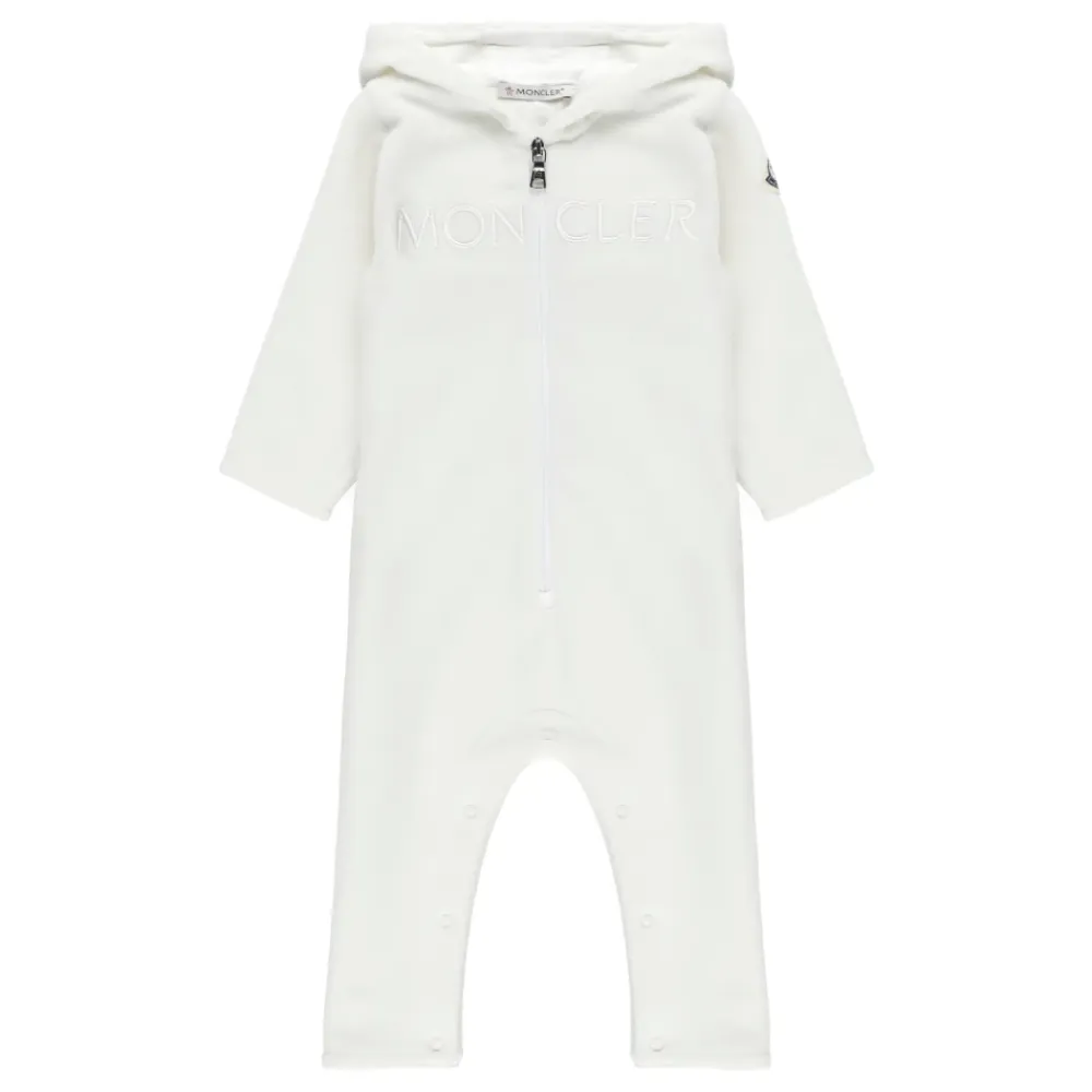 Kleiden Sie Ihren kleinen Jungen stilvoll mit diesem Ivory Moncler Baby-Strampler. Mit Kapuze, langen Ärmeln und einer kontrastierenden farbigen Logo-Patch am linken Ärmel. Dieser Strampler hat auch einen Frontreißverschluss, ein kontrastierendes farbiges gesticktes Logo vorne und Druckknöpfe im Schritt.