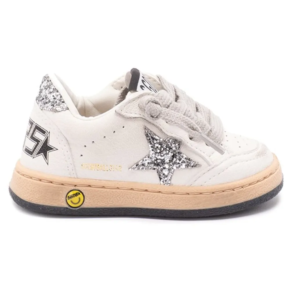 Der Golden Goose Ball Star Sneaker aus Nappaleder kombiniert Vintage-inspiriertes Design mit einem markanten silbernen Glitzerstern und einer passenden Fersenlasche. Artikelnummer GYF00439.F004826.80185. Hauptmerkmale: Weiß | Silber | Nappaleder | Schnürverschluss | Gummisohle | Handgefertigte Konstruktion | Silberner Glitzerstern | Silberne Glitzer-Fersenlasche | Smiley-Detail auf der Foxing | Eisgraue Schnürsenkel | Vintage-Finish | Schwarze Sohle | Zusammensetzung & Pflege: Obermaterial: 93 % Schafsleder, 4 % Polyethylenterephthalat, 3 % Baumwolle | Futter: 44 % Baumwolle, 25 % Rindsleder, 20 % textiles Polyurethan, 6 % Polyester, 5 % Viskose | Sohle: 100 % Gummi