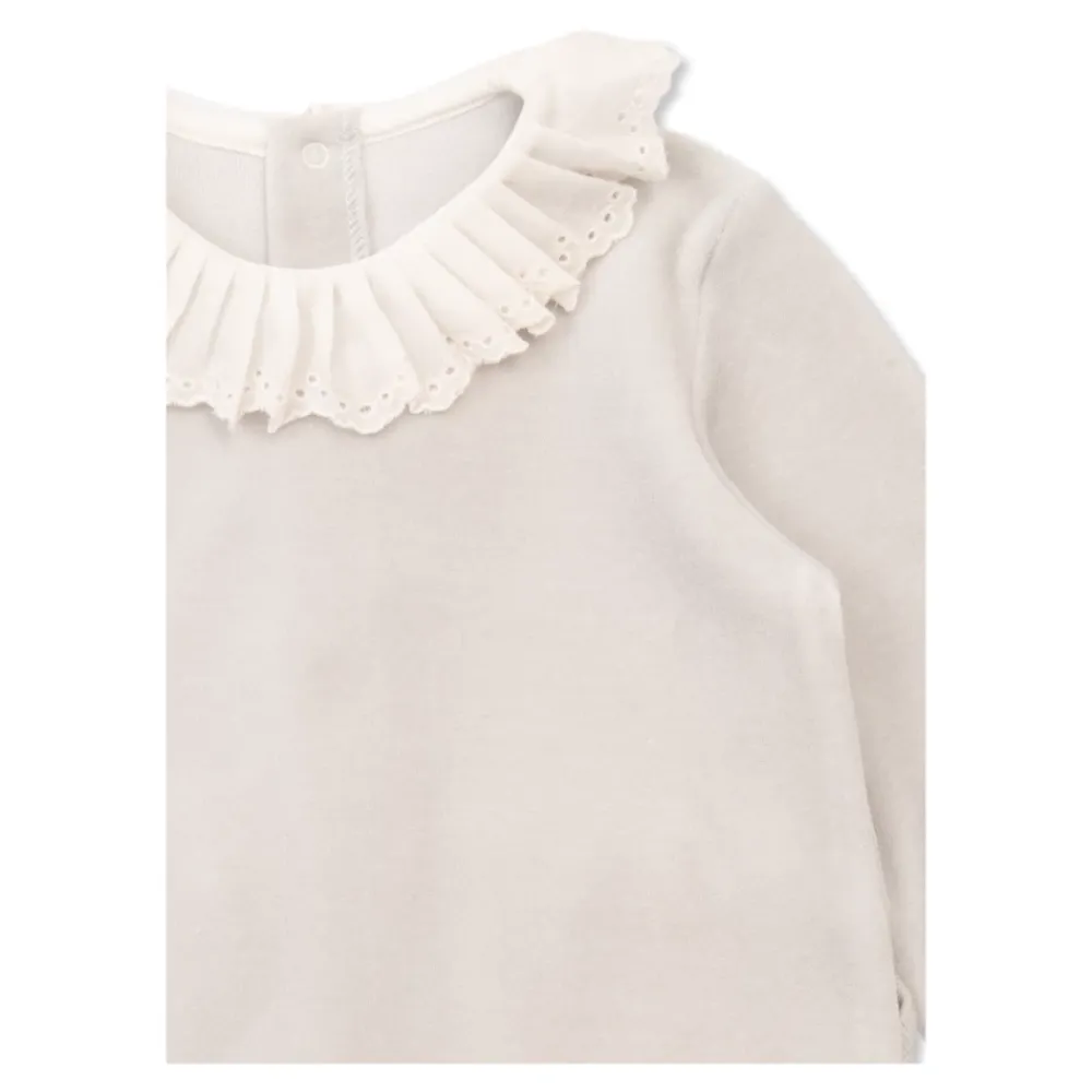 Hellgraues Strampler von Bonpoint. Aus Baumwolle gefertigt, schließt dieses Modell mit Druckknöpfen auf der Rückseite und verfügt über einen weißen Kragen mit Lochmuster und lange Ärmel mit elastischen Bündchen.