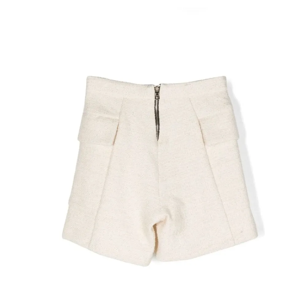 Ergänzen Sie die Garderobe Ihrer kleinen Tochter mit diesen beigen Baumwollshorts von Balmain. Hergestellt aus einer Mischung aus reiner Wolle, haben diese Shorts eine gestrickte Konstruktion mit einer Chenille-Textur. Die geprägten goldfarbenen Knöpfe und die Dart-Details verleihen einen Hauch von Luxus, während die beiden seitlichen Klappentaschen und der Reißverschluss hinten praktisch sind. Das hohe, gerade Bein-Design ist perfekt für jeden Anlass.