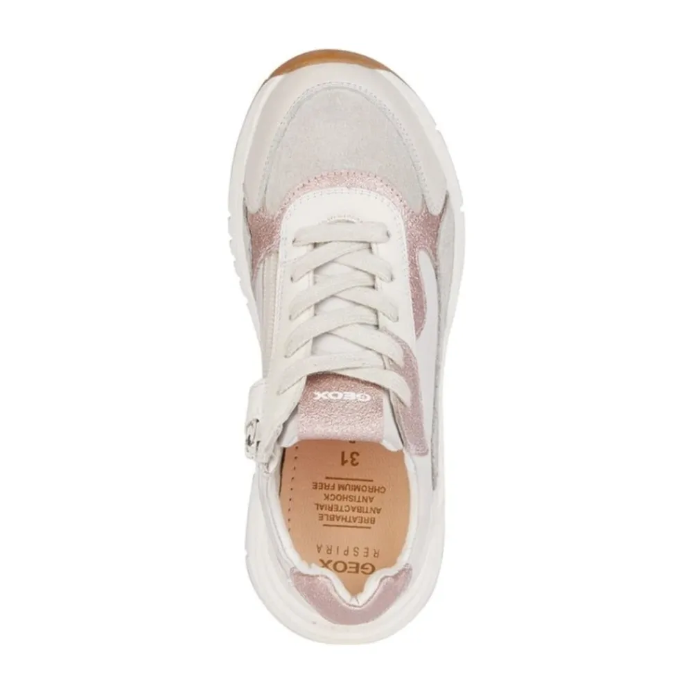 Geox Mädchen Beige Sneakers – Kinderschuhe – Stilvolle und bequeme Sneakers für Mädchen von Geox. Hergestellt aus einer Mischung aus Wildleder, Polyurethan, Polyester und Rindsleder. Mit einem Polyesterfutter und einer thermoplastischen Gummisohle. Produktcode: J4597B 022FU C1Q8W.