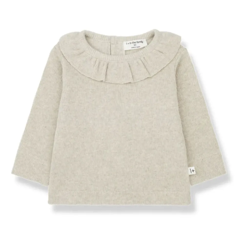 Bleiben Sie gemütlich und stilvoll mit diesem grauen Baumwoll-Anna-Pullover von 1 + IN THE FAMILY. Mit Rundhalsausschnitt, langen Ärmeln und Knopfverschluss hinten ist dieser Pullover perfekt für die Garderobe Ihres kleinen Mädchens.