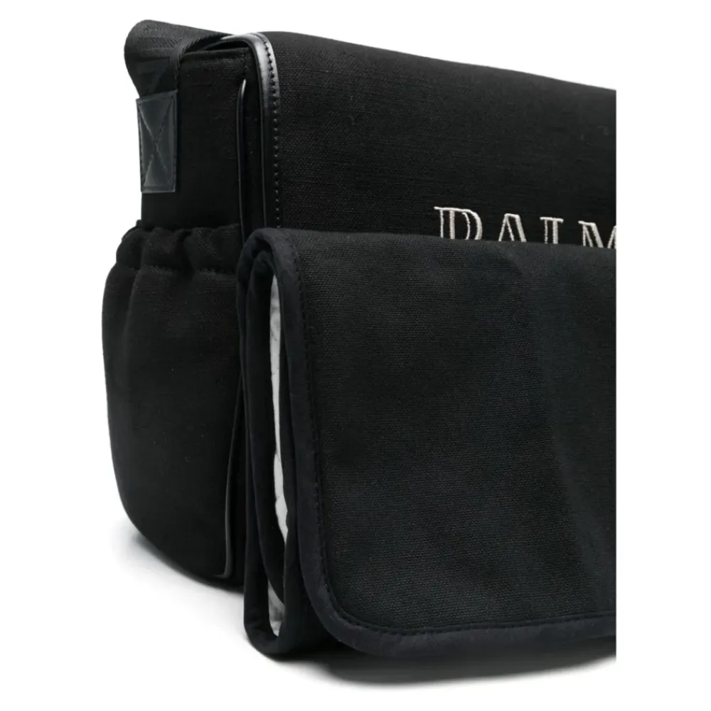Balmain Kinder Taschen: Hergestellt aus einer luxuriösen Mischung aus Baumwolle und Leinen, verfügt diese Tasche über einen magnetischen Verschluss auf der Vorderseite, einen verstellbaren schwarzen Schultergurt für optimalen Komfort, praktische Seitentaschen und eine interne Wickelauflage für alle Bedürfnisse. Die bestickte beige Logo-Dekoration auf der Vorderseite verleiht einen markanten und raffinierten Touch. Die großzügigen Abmessungen von 38 cm Länge, 26 cm Höhe und 15 cm Tiefe bieten ausreichend Platz für eine makellose Organisation. Die Stoffzusammensetzung von 58% Baumwolle und 42% Leinen sorgt für eine angenehme Kombination aus Leichtigkeit und Strapazierfähigkeit. Befolgen Sie die Waschanweisungen auf dem Etikett im Kleidungsstück. Hergestellt in Italien.