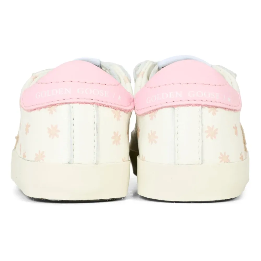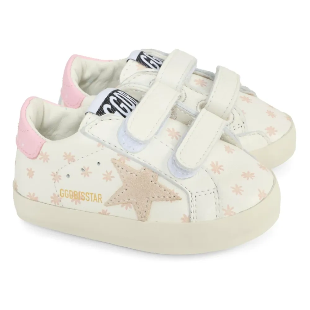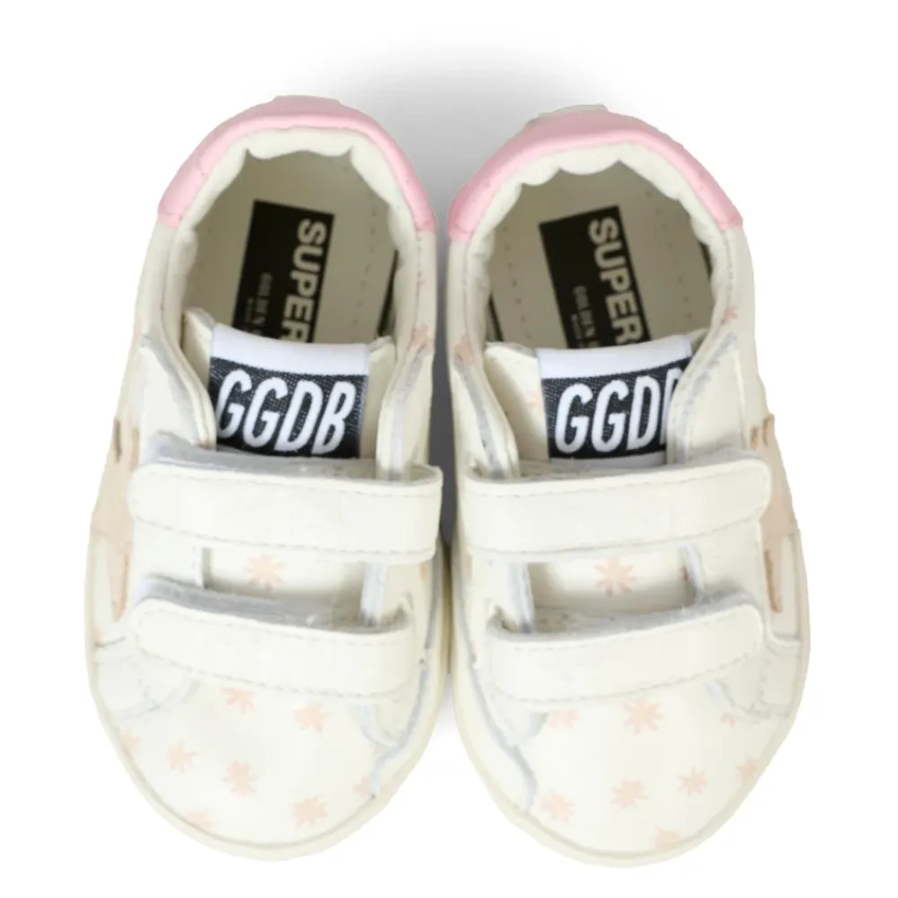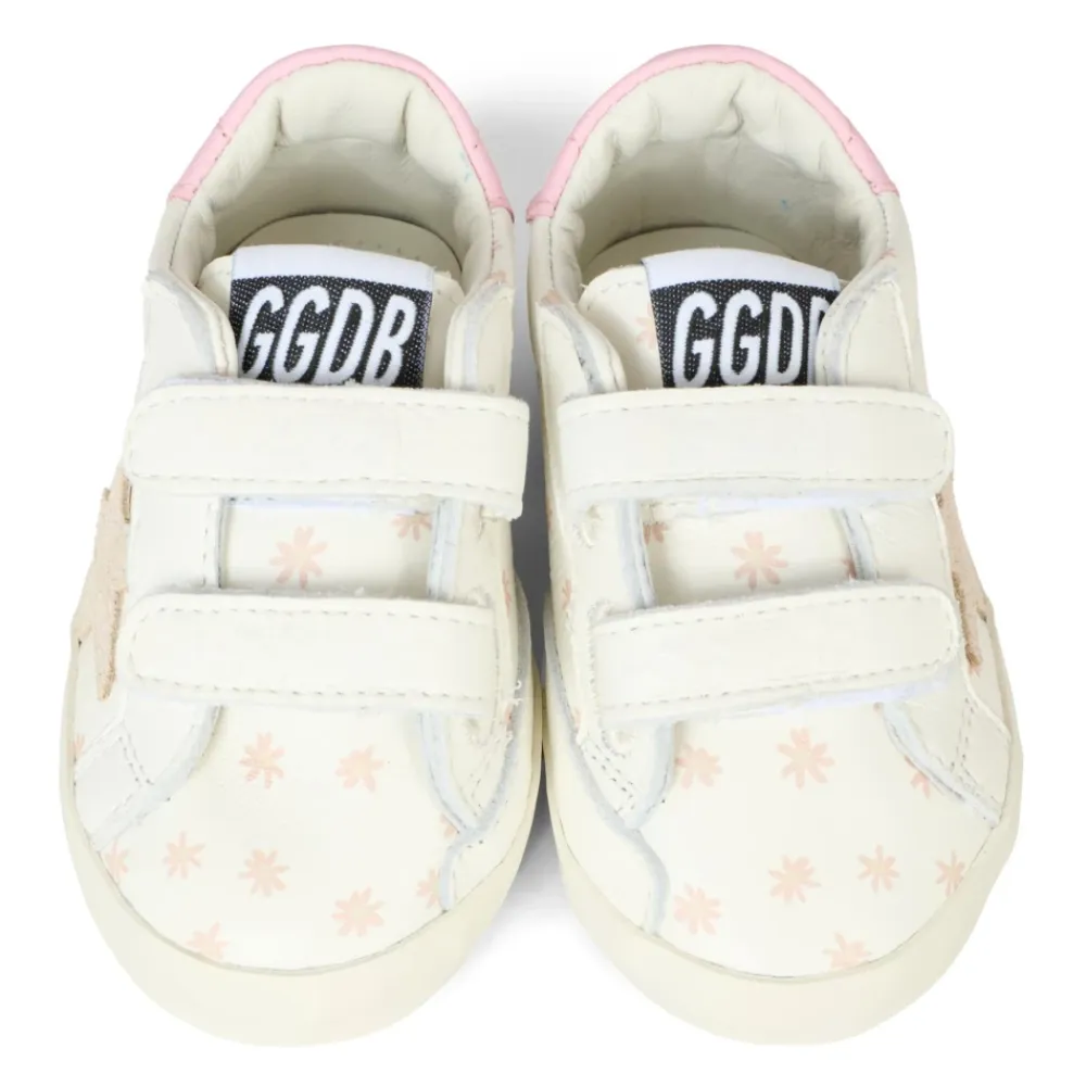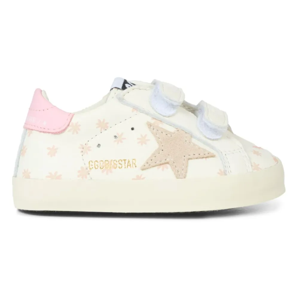 Steigern Sie den Stil Ihres Kindes mit diesen weißen Old School Sneakers von Golden Goose. Mit zwei Riemenverschlüssen mit kontrastierendem Logo, weißem Nappaleder-Obermaterial, runder Zehenpartie, Blumendetails und einem Stern an der Seite. Hergestellt in Italien aus 100% Leder.