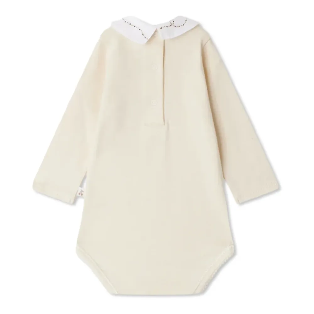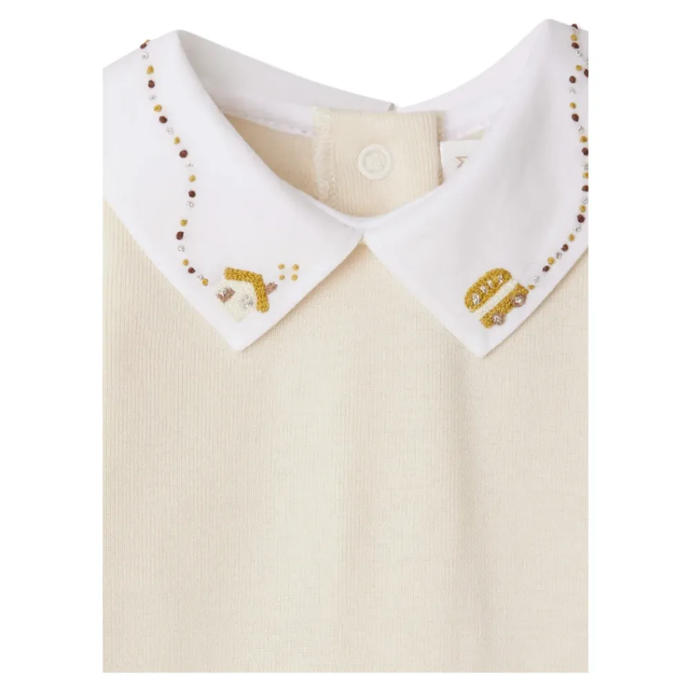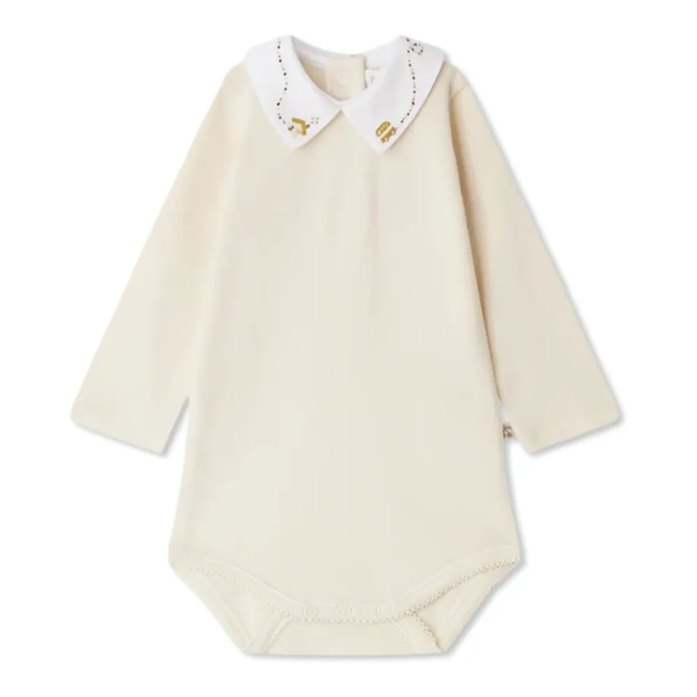 KRAVATTIERTE BODY von Bonpoint ist die Essenz subtiler, raffinierter Eleganz, geschaffen mit den Jüngsten im Sinn. Die klassische, maßgeschneiderte Passform mit langen Ärmeln und einem sorgfältig gearbeiteten schneeweißen Kragen, verziert mit goldenen Stickereien, unterstreicht den zeitlosen Charakter des Produkts. Exklusiv aus weicher Baumwolle gefertigt, präsentiert sie sich außergewöhnlich anmutig in einem cremigen Farbton, während der schlichte Schnitt sie zu einer universellen Wahl für jeden Anlass macht. Diskrete Druckknöpfe im Schritt ermöglichen bequeme und schnelle Windelwechsel, ohne die Harmonie des Ganzen zu stören. Bonpoint, ein Modell französischer Exzellenz, achtet auf jedes Detail und verbindet die Zartheit der Materialien mit herausragender Ästhetik. WARUM DIESES PRODUKT WÄHLEN? * Luxuriöses, natürliches Material, sanft zur Haut eines Kindes * Einzigartiger dekorativer Kragen mit aufwendigen Stickereien * Praktischer, diskreter Druckverschluss * Einzigartiges Design im Geist der französischen Tradition * Eleganter Minimalismus für jeden Anlass geeignet