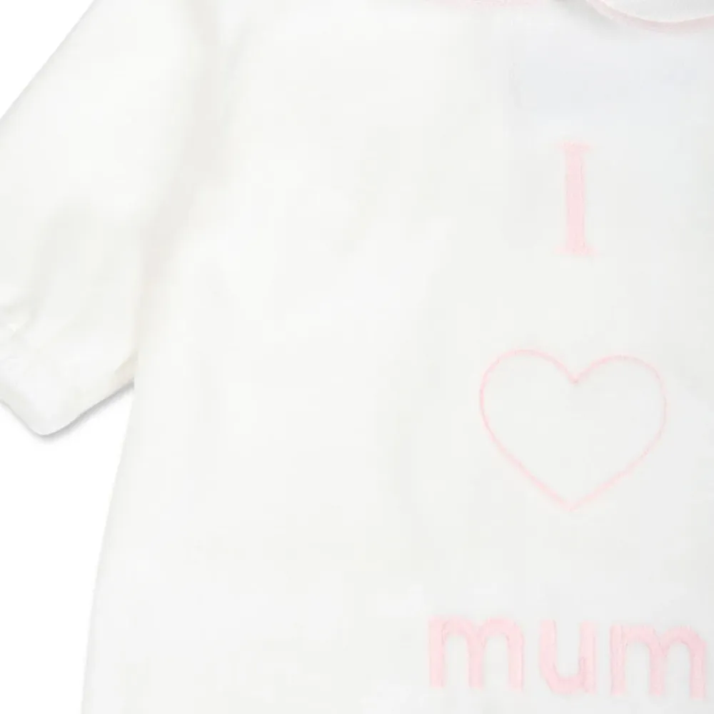 Kleiden Sie Ihr Kleines stilvoll in diesen weißen Chenille-Strampler von Little Bear. Mit langen Ärmeln, einem Peter Pan-Kragen mit rosa Profilen, Druckknopfverschluss auf der Rückseite und elastischen Füßen und Bündchen. Verziert mit einem Herz und der Stickerei ‚Mum‘ auf der Vorderseite. Hergestellt in Italien aus 80% Baumwolle und 20% Polyamid. Nur Handwäsche.