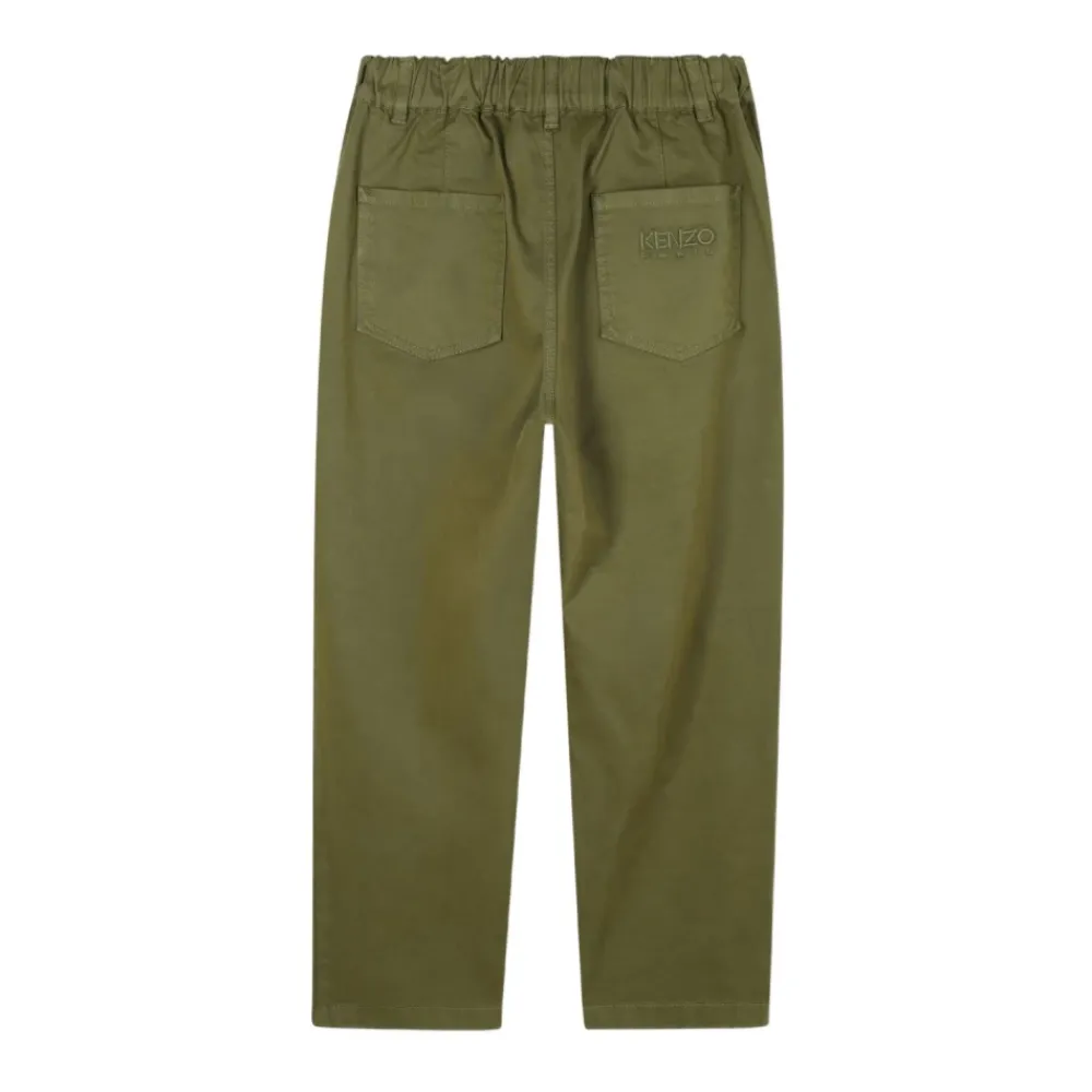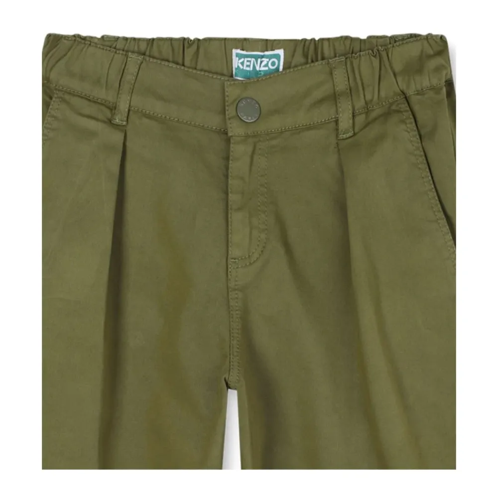 Kenzo Chinos mit Bundfalten und einem elastischen Bund, entworfen für bequemen Alltagskomfort und einen gleichzeitig eleganten Look. Hauptmerkmale: Olivgrün | Elastischer Bund | Aufgesetzte Gesäßtaschen | Bundfalten