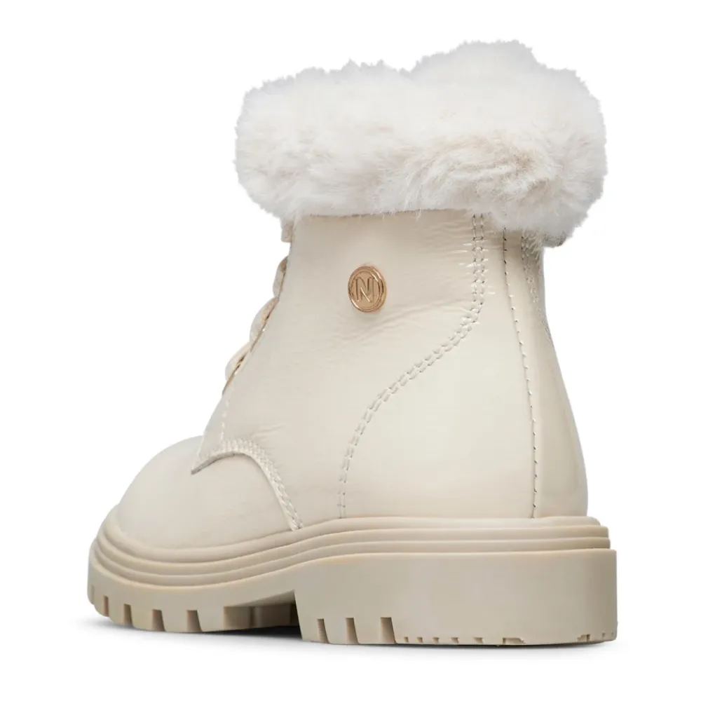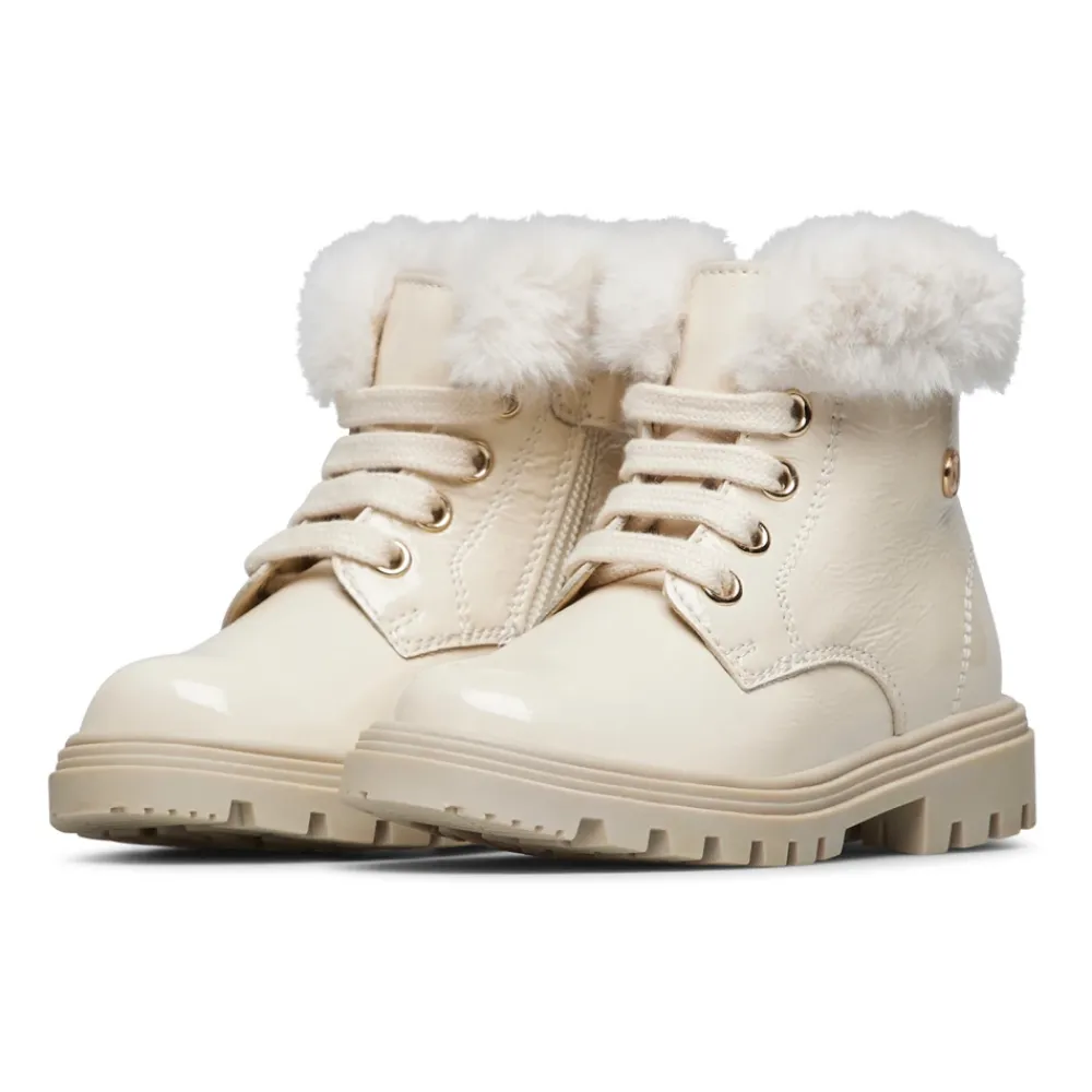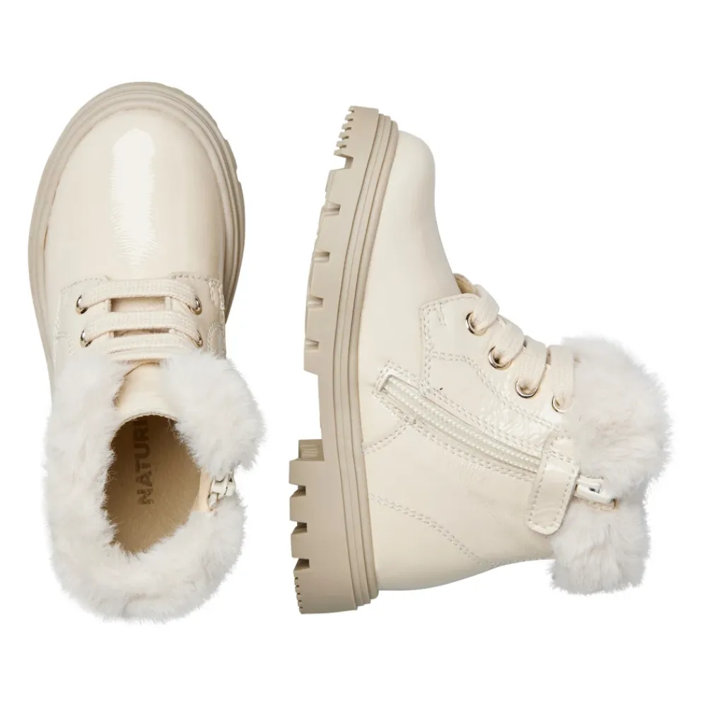 Naturino Clar Zip ist ein Knöchelhoher Stiefel aus Lackleder, der ein glänzendes Finish mit einem Schnür- und Reißverschluss für einfaches An- und Ausziehen sowie sicheren Halt kombiniert. Er verbindet ein ledergefüttertes Interieur mit einer profilierten Gummisohle für den täglichen Gebrauch. Hauptmerkmale: Cremeweiß | Lackleder | Profilierte Gummilaufsohle | Rutschfeste Sohle | Schnür- und Reißverschluss | Lederfutter und Innensohle | Lack-Finish | Knöchelhoch | Maße & Passform: Knöchelhoch | Material & Pflege: Lackleder (außen) | Leder (Futter und Innensohle) | Gummi (Laufsohle)