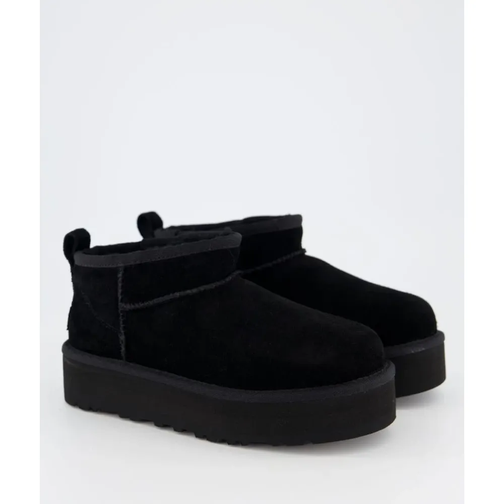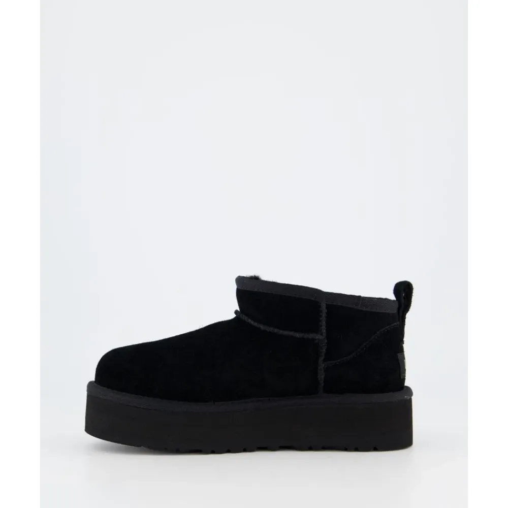 Die UGG Classic Ultra Mini Platform kombiniert eine kompakte Plateausohle mit weichem UGGplush-Futter für bequemen Tragekomfort im Alltag. Das Design bietet eine Balance aus weichem, gepolstertem Gefühl und einfacher Funktionalität beim An- und Ausziehen. Hauptmerkmale: Schwarz | Zwart | Wildleder | Leichte EVA-Plateausohle | Gepolsterte Innensohle | Weiches UGGplush-Futter | Zuglasche hinten für einfaches An- und Ausziehen | Schaumstoff-Fußbett | Asymmetrische Oberlinie | Overlock-Stichdetails | Typische Zwillingsnähte | Plateauprofil | Maße und Passform: Fällt größengetreu aus – bestellen Sie Ihre übliche Größe. | Zusammensetzung und Pflege: Obermaterial: Wildleder | Futter: 17 mm UGGplush (60 % Wolle, 40 % TENCEL Lyocell) | Innensohle: 17 mm UGGplush (60 % Wolle, 40 % TENCEL Lyocell) | Zwischensohle: EVA | Laufsohle: Zuckerrohr-EVA | Fußbett: Schaumstoff