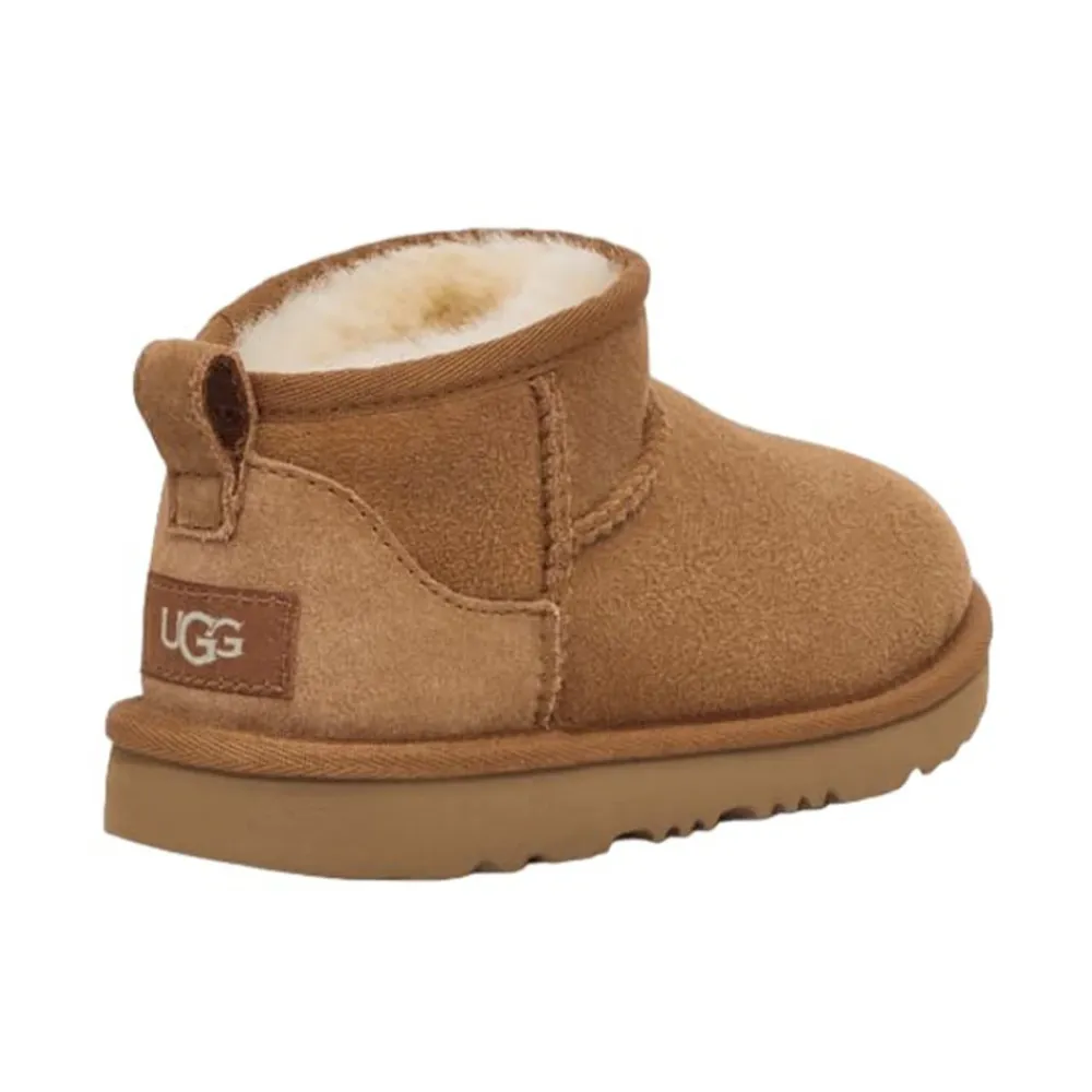 Der UGG Classic Ultra Mini bietet ein niedriges Knöchelprofil mit weichem Wollfutter für einfaches An- und Ausziehen und Wärme. Er ist für den täglichen Gebrauch konzipiert und kombiniert ein Obermaterial aus Wildleder mit einer leichten, flexiblen Sohle für bequemes Spielen. Hauptmerkmale: Braun | Wildleder | Topische wasserabweisende Behandlung | Leichte, flexible Sohle | Wollfutter zur Isolierung | Zuglasche hinten für einfaches An- und Ausziehen | Knöchelhohe Silhouette | Asymmetrische Oberlinie | Overlock-Stichdetails | Abmessungen und Passform: Schafthöhe: 8,9 cm | Normale Passform | Zusammensetzung und Pflege: Wildleder | Gummisohle | Wollfutter | Topisch behandelt für leichte Wasserabweisung; punktuelle Reinigung mit einem feuchten Tuch und an der Luft trocknen lassen. Tragen Sie regelmäßig eine wasserabweisende Behandlung auf, um den Schutz aufrechtzuerhalten.
