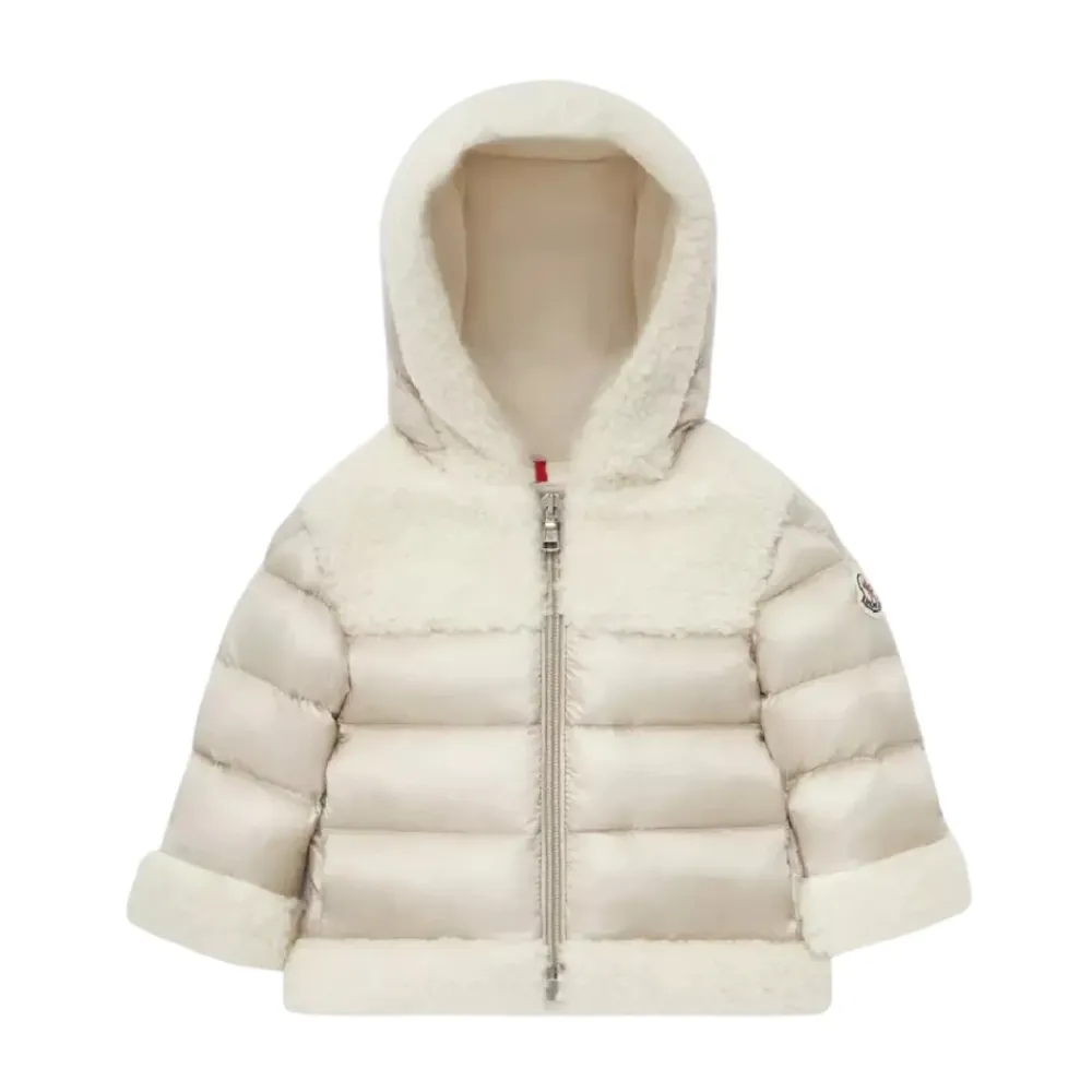 Moncler Kids Dofi Jacke in Beige mit Reißverschluss, fester Kapuze, Seitennahttaschen, Logo-Patch am linken Ärmel, Plüsch-Kapuze, Bündchen und Saumabschluss, horizontales Steppmuster gefüllt mit Daunenfedern.