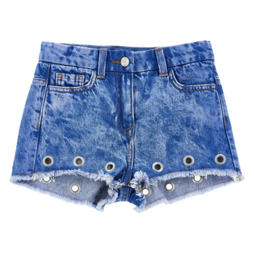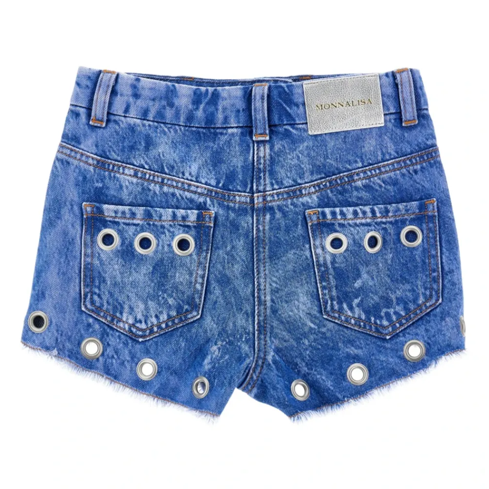 Die Monnalisa Denim Shorts bieten einen Blue-Wash-Look mit verwaschenen Details, Ziernieten und einem ausgefransten Saum für ein lässiges, strukturiertes Finish. Die Five-Pocket-Konstruktion bietet praktischen Stauraum für den Alltag. Hauptmerkmale: Blau | Denim | Baumwolle | Five-Pocket-Design | Verwaschene Details | Ziernieten auf beiden Seiten | Ausgefranster Saum | Materialzusammensetzung und Pflege: 100% Baumwolle