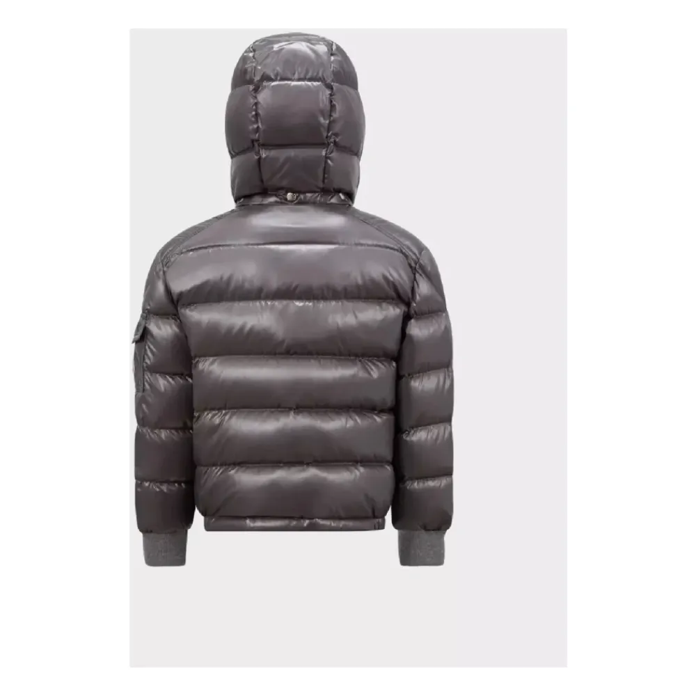 Moncler Kids Manaem Jacke in Dunkelgrau, mit Reißverschluss und Druckknöpfen, abnehmbarer Kapuze, hohem Kragen, Taschen mit Druckknopf, lange Ärmel mit Rippbündchen, Tasche mit Druckknopf am linken Ärmel, gestepptes Design gefüllt mit Daunen, hergestellt aus hochwertigen Materialien einschließlich Federn, Polyester und Daunen.