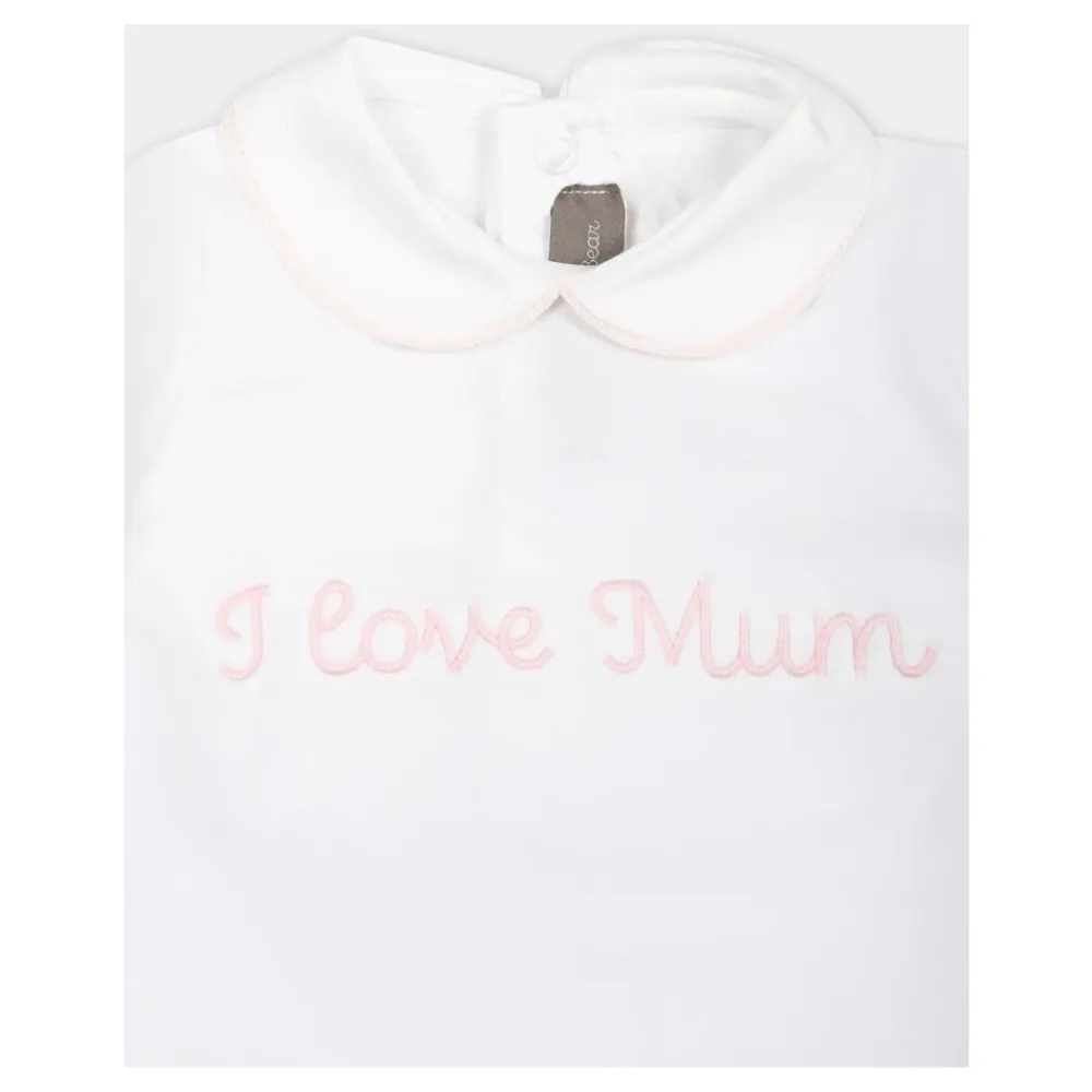 Little Bear weiße Stretch-Baumwollpyjamas für Kinder mit besticktem Slogan, kontrastierendem Besatz, abgerundetem Kragen, Druckknopfverschluss, langen Ärmeln und Stiefeln.