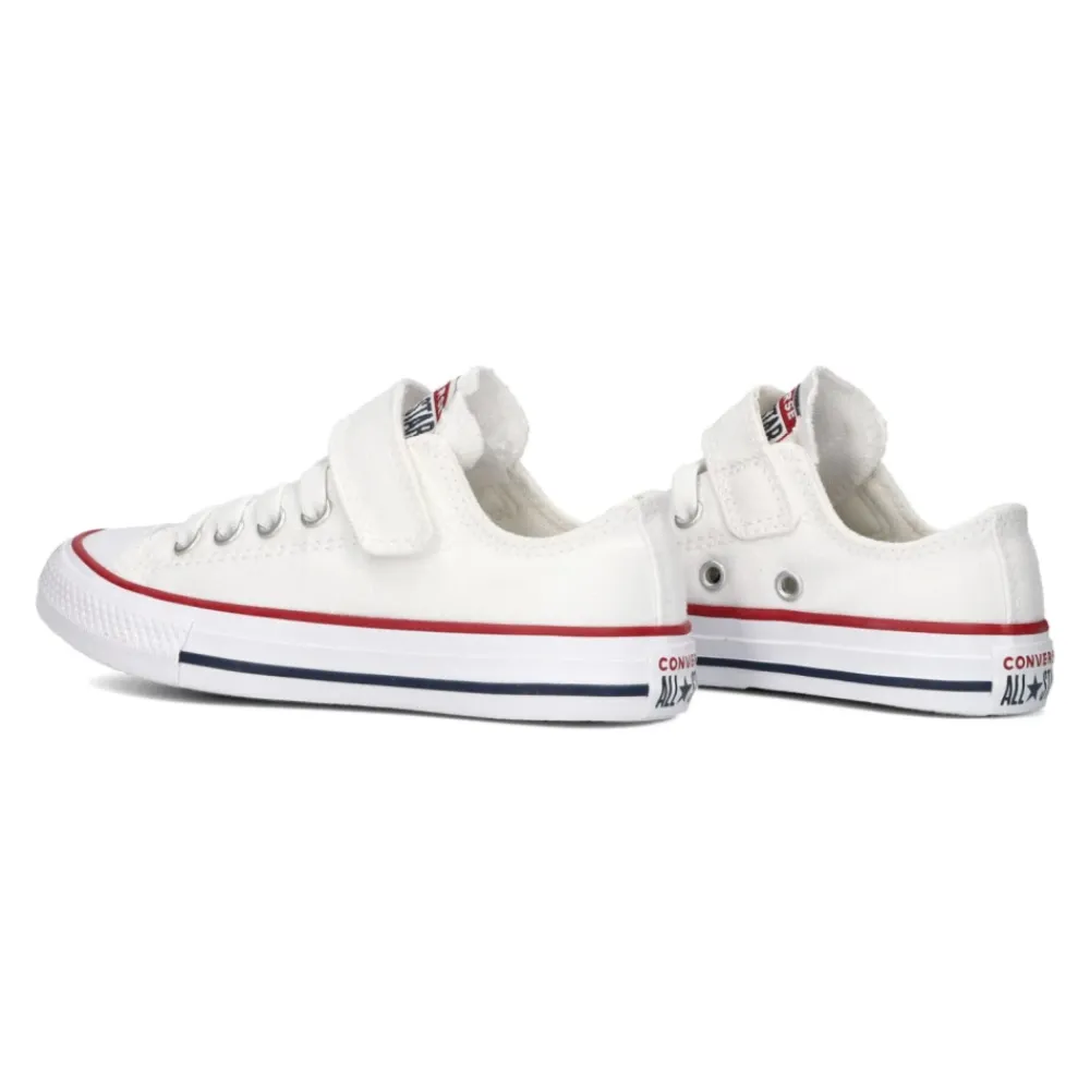 Verleihen Sie dem Stil Ihres kleinen Mädchens mit diesen weißen Canvas Chuck Taylor All Star Sneakers von Converse eine neue Dimension. Mit ikonischen Details wie der Gummikappe, dem Markenpatch an der Seite und dem Logo an der Ferse sind diese Low-Top-Sneakers perfekt für den täglichen Gebrauch. Das weiche Mesh-Textilfutter und die herausnehmbare gepolsterte Innensohle bieten ausreichend Unterstützung. Der Klettverschluss an den Schnürsenkeln verleiht einen verspielten Touch, während die Gummisohle mit grobem Profil für hervorragende Traktion sorgt. Kombinieren Sie sie mit jedem Outfit für einen Retro-Look.