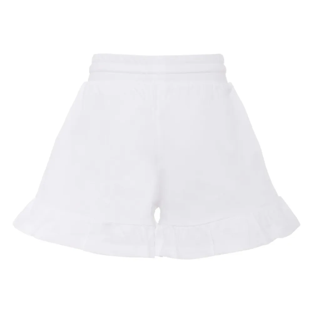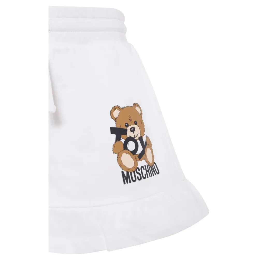 Aktualisieren Sie die Garderobe Ihres Kleinen mit diesen weißen Shorts von Moschino Kids. Hergestellt aus gebürsteter Baumwolle, verfügen sie über einen elastischen Bund, Kordelzug, Seitentaschen und einen bezaubernden gerüschten Saum. Verziert mit Teddybär, Spielzeug-Schriftzug und Logo-Drucken auf der Vorderseite. Hergestellt aus 100% Baumwolle. Maschinenwäsche bei 30°C.