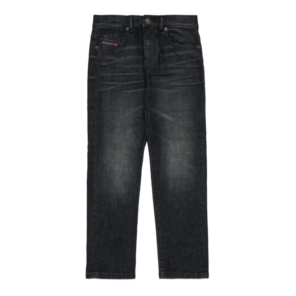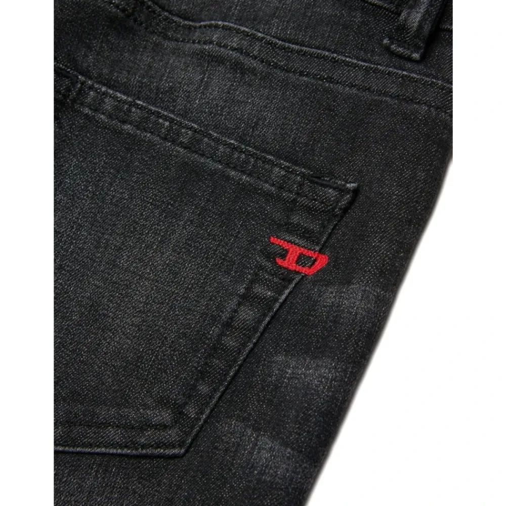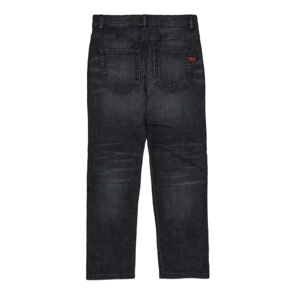 Schwarze Diesel-Jeans für Jungen mit vorderer Knopfleiste, Gürtelschlaufen, klassischen fünf Taschen und gesticktem Logo auf der Rückseite.