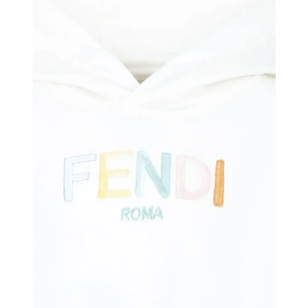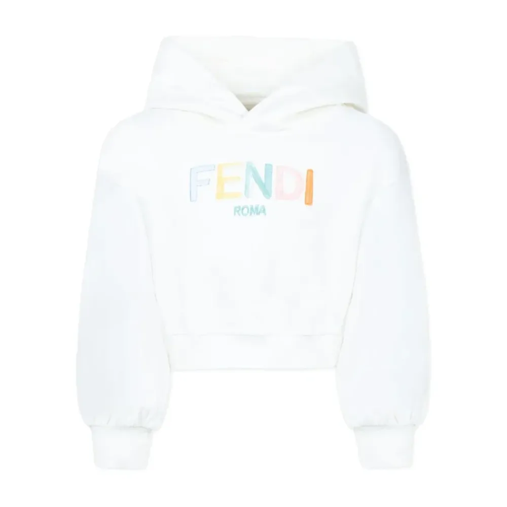 Bleiben Sie mit diesem Fendi weißen Cropped-Hoodie für Mädchen stilvoll. Mit einer mehrfarbigen Fendi-Stickerei auf der Vorderseite und langen Ärmeln. Hergestellt aus 100% Baumwolle. JFH153 5V0.