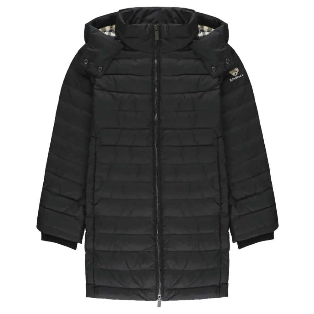 Bleiben Sie warm und stilvoll mit dieser schwarzen Burberry Kids Daunenjacke für Mädchen. Mit Kapuze mit Knöpfen, langen Ärmeln und einem kontrastierenden farbigen Logo-Patch am linken Ärmel. Diese Jacke verfügt auch über zwei seitliche Schlitztaschen und einen Frontreißverschluss.