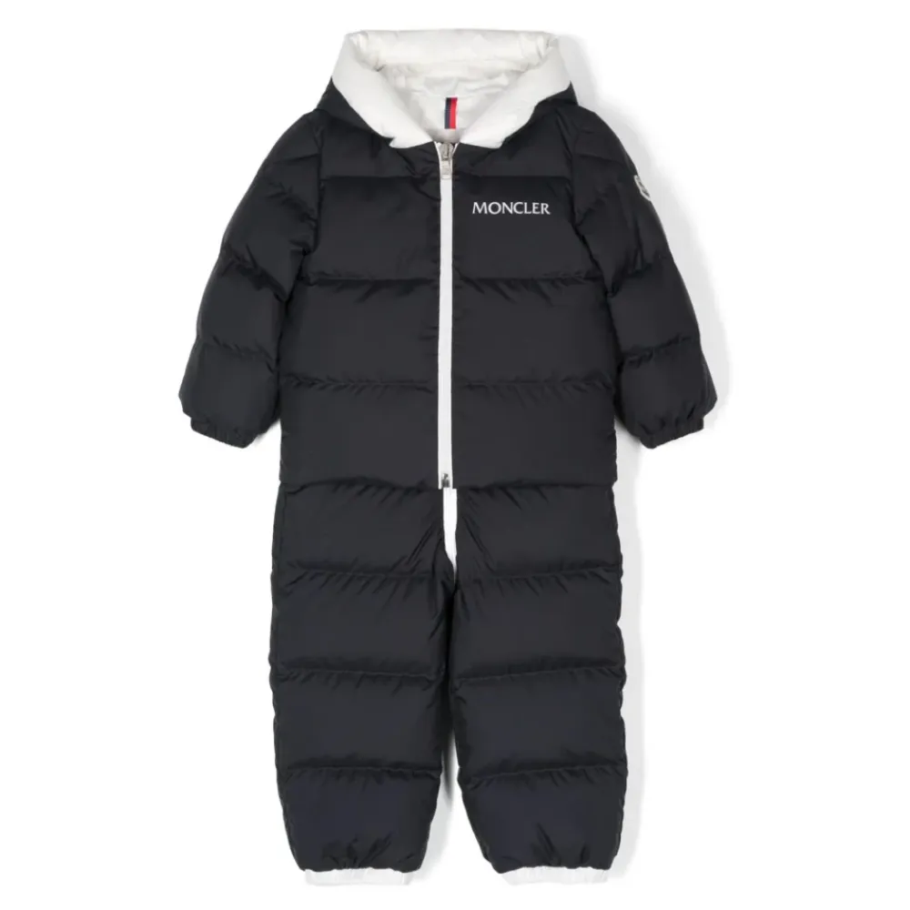 Bleiben Sie warm und stilvoll mit diesem blauen Moncler Kinderoverall für draußen mit einer Eskimo-Applikation aus Gänsedaunen mit Logo auf der Brust, Kapuze, langen Ärmeln, elastischen Bündchen und Frontreißverschluss.