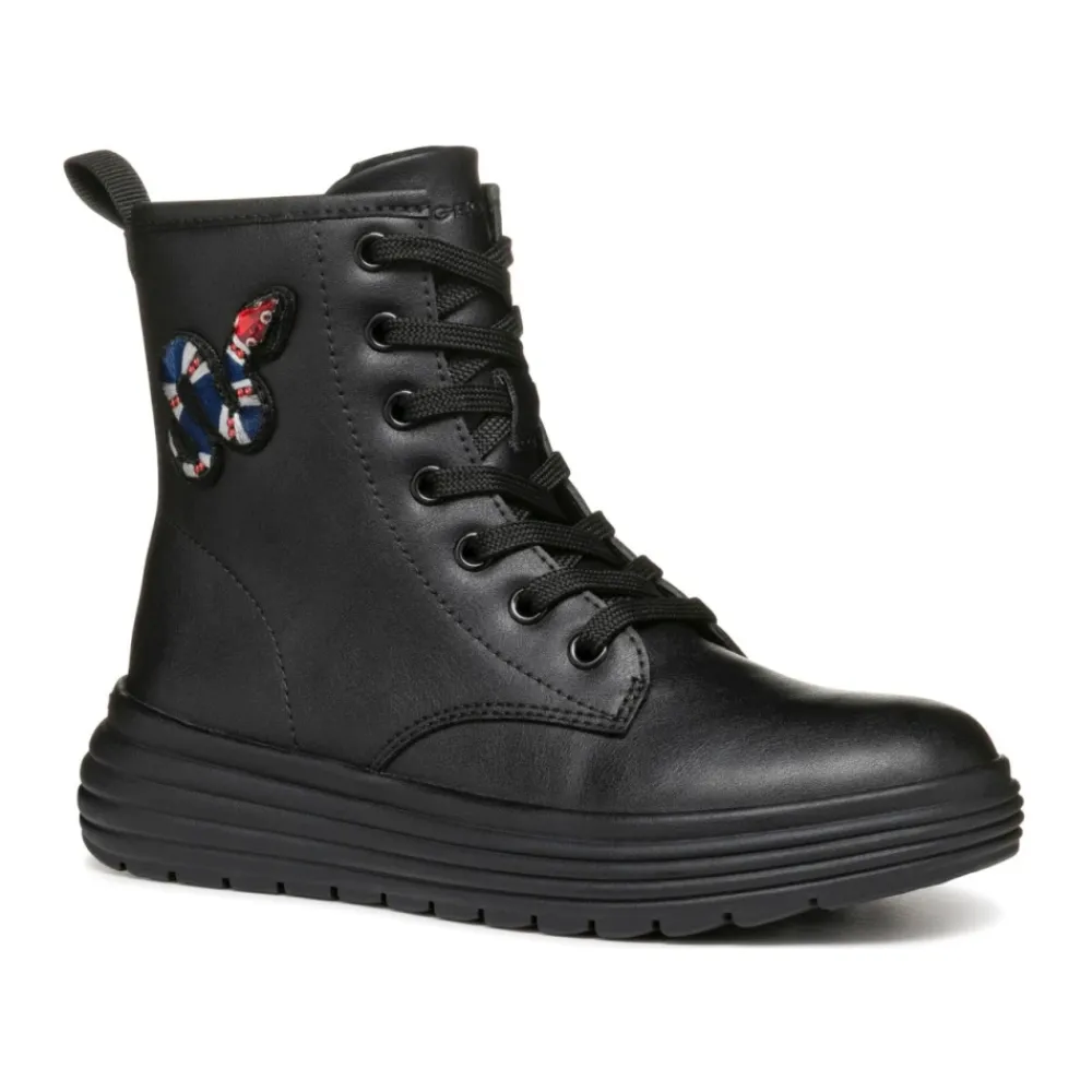 Kaufen Sie diese stilvollen Geox-Stiefel für Mädchen, perfekt für Kinder. Diese schwarzen Stiefel (Produktcode: J46ETE 000BC C9999) bestehen aus 100% Polyurethan (PU) Obermaterial, Wolle, Polyester (PES) und Polyurethan (PU) Innenfutter sowie 100% Polyurethan (PU) Sohle.