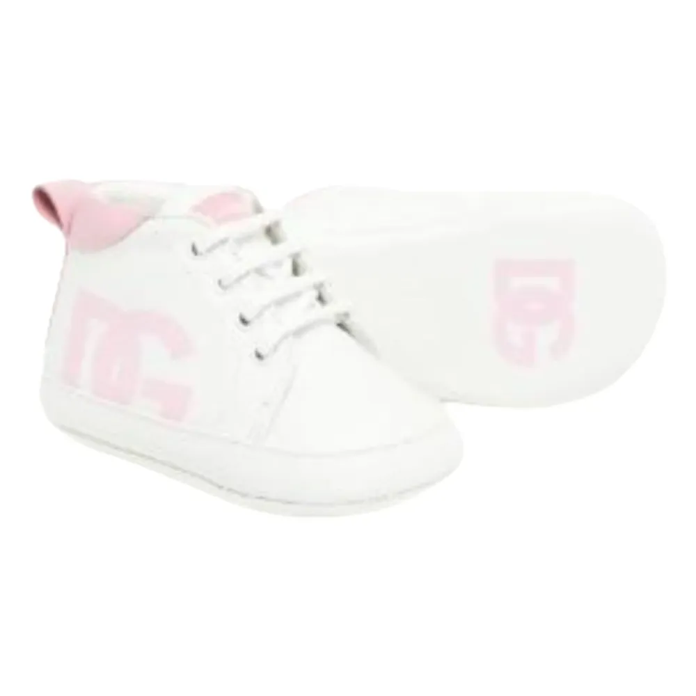 Entdecken Sie die Dolce & Gabbana Kids Pre-Walker Schuhe aus weißem Leder mit rosa Akzenten und Logo. Diese Sneaker haben Schnürsenkel, eine runde Zehenkappe und sind mit sehr weichem Leder gefüttert für maximalen Komfort. Die flexible Ledersohle zeigt das ikonische Dolce & Gabbana Logo. Hergestellt in Italien, sind diese Schuhe perfekt für Ihre kleine Fashionista.