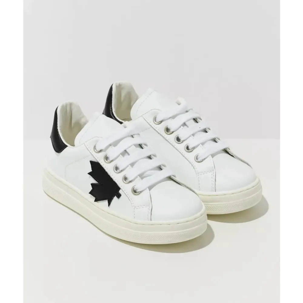 Stilvolle weiße Sneaker von Dsquared2 Kids, mit schwarzem Markenlogo an den Seiten. Klassisches Schnürdesign mit runden Zehen, bequemer gepolsterter Innensohle, weiße Gummisohle und kontrastierender schwarzer Absatz mit Dsquared2 Kids Logo. Hergestellt aus hochwertigem echtem Leder, hergestellt in Italien. Sohlenhöhe: 2 cm.