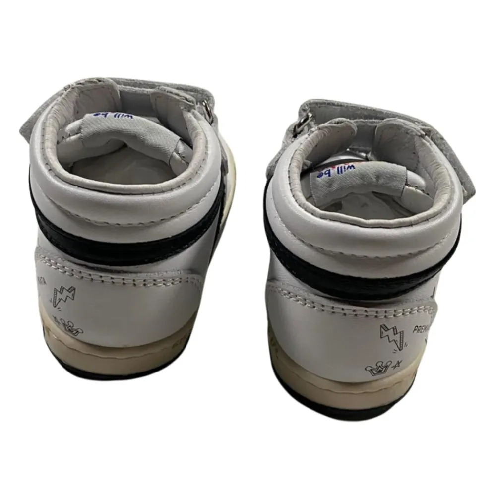 Premiata Kids weiße Sneaker, Low-Top-Modell aus weichem Nappaleder, mit Lederüberzügen verziert, Premiata-Logo an der Seite, signierte bedruckte Zwischensohle und einfacher Doppelklettverschluss. Hergestellt in Italien. 100% Leder.