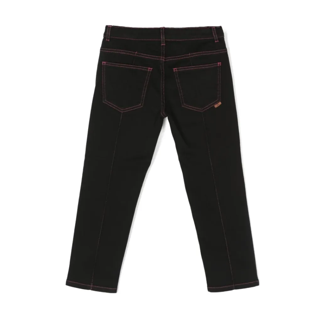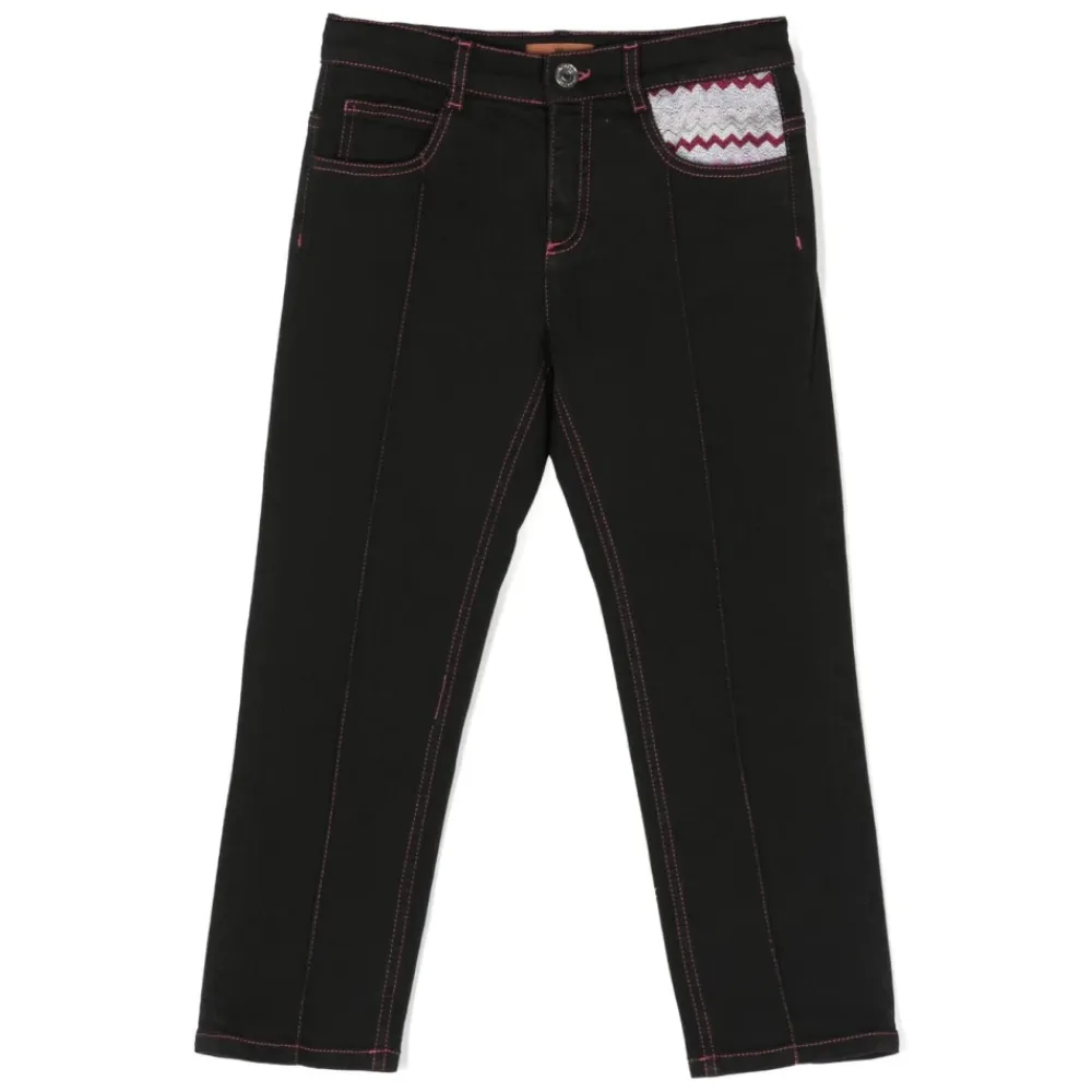 Upgrade die Garderobe deiner kleinen Fashionista mit diesen Skinny-Jeans mit Kontrastnähten von Missoni Kids. Hergestellt aus schwarzem Stretch-Baumwoll-Denim, verfügen diese Jeans über das charakteristische Zickzack-Gewebedesign und Kontrastnähte der Marke für einen stilvollen Look. Mit einem Mini-Logo-Tag, Gürtelschlaufen, einem Skinny-Schnitt, Knopfleiste und klassischen fünf Taschen komplettiert, sind diese Jeans sowohl modisch als auch funktional. Bitte beachte, dass das Produkt, das du erhältst, aufgrund der handwerklichen Natur aller Missoni-Produkte geringfügig von dem fotografierten Artikel abweichen kann.