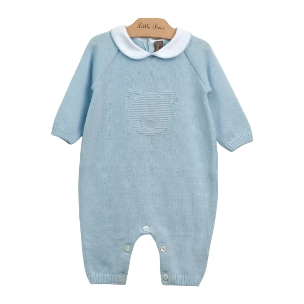Little Bear himmelblauer Baumwoll-Overall für Kinder, mit langen Ärmeln, weißem Baumwoll-Popeline-Peter-Pan-Kragen, Perlmuttknöpfen auf der Rückseite und zwischen den Beinen, gerippten Bündchen und Knöcheln. Verziert mit einem himmelblauen Bären auf der Vorderseite. Hergestellt in Italien.