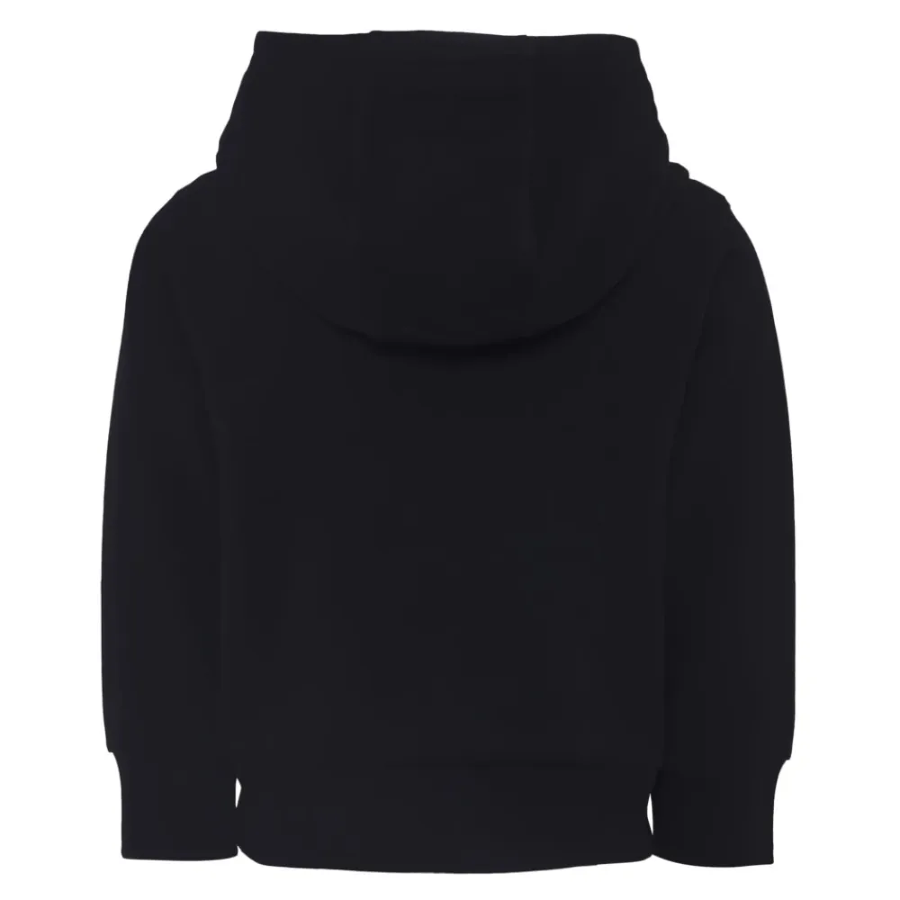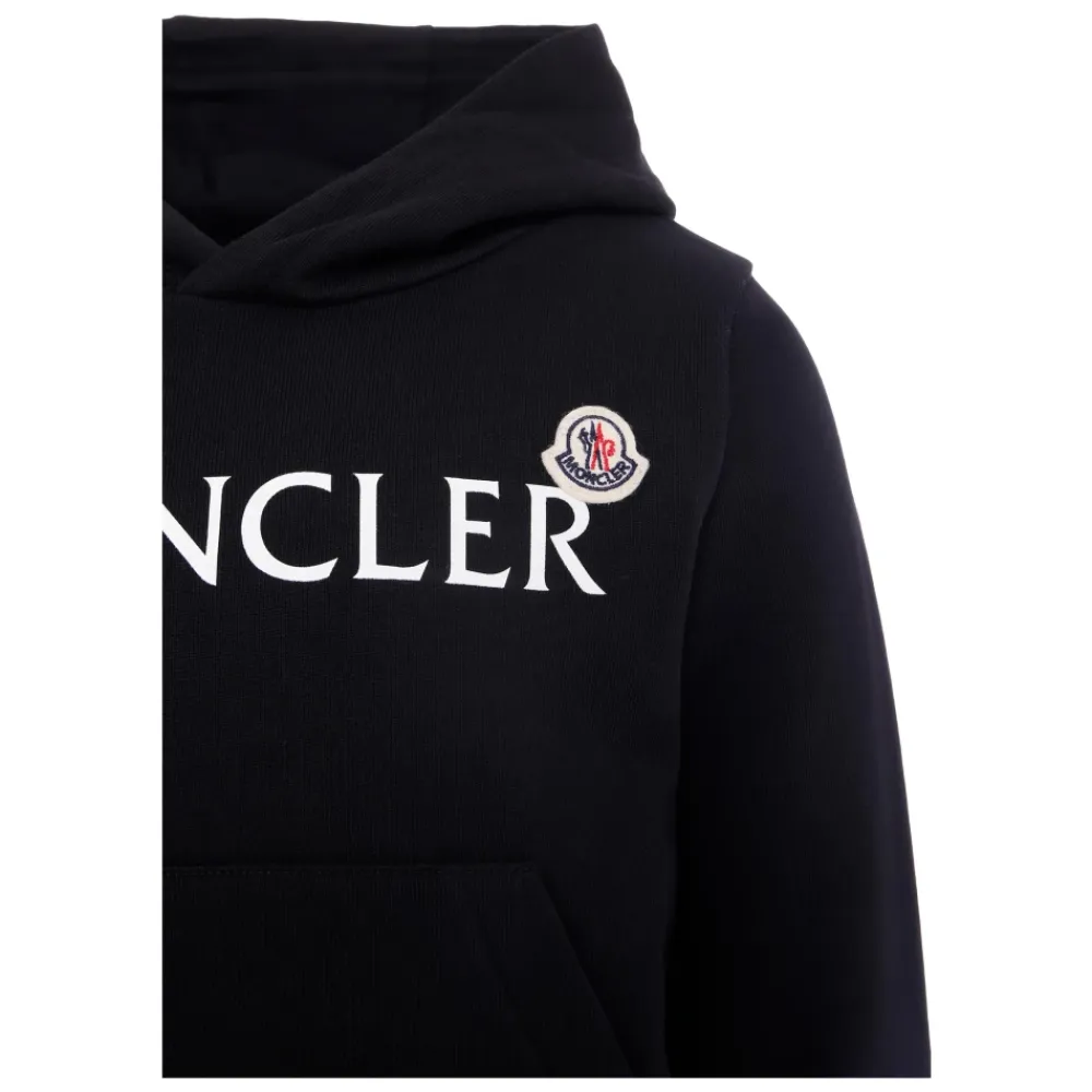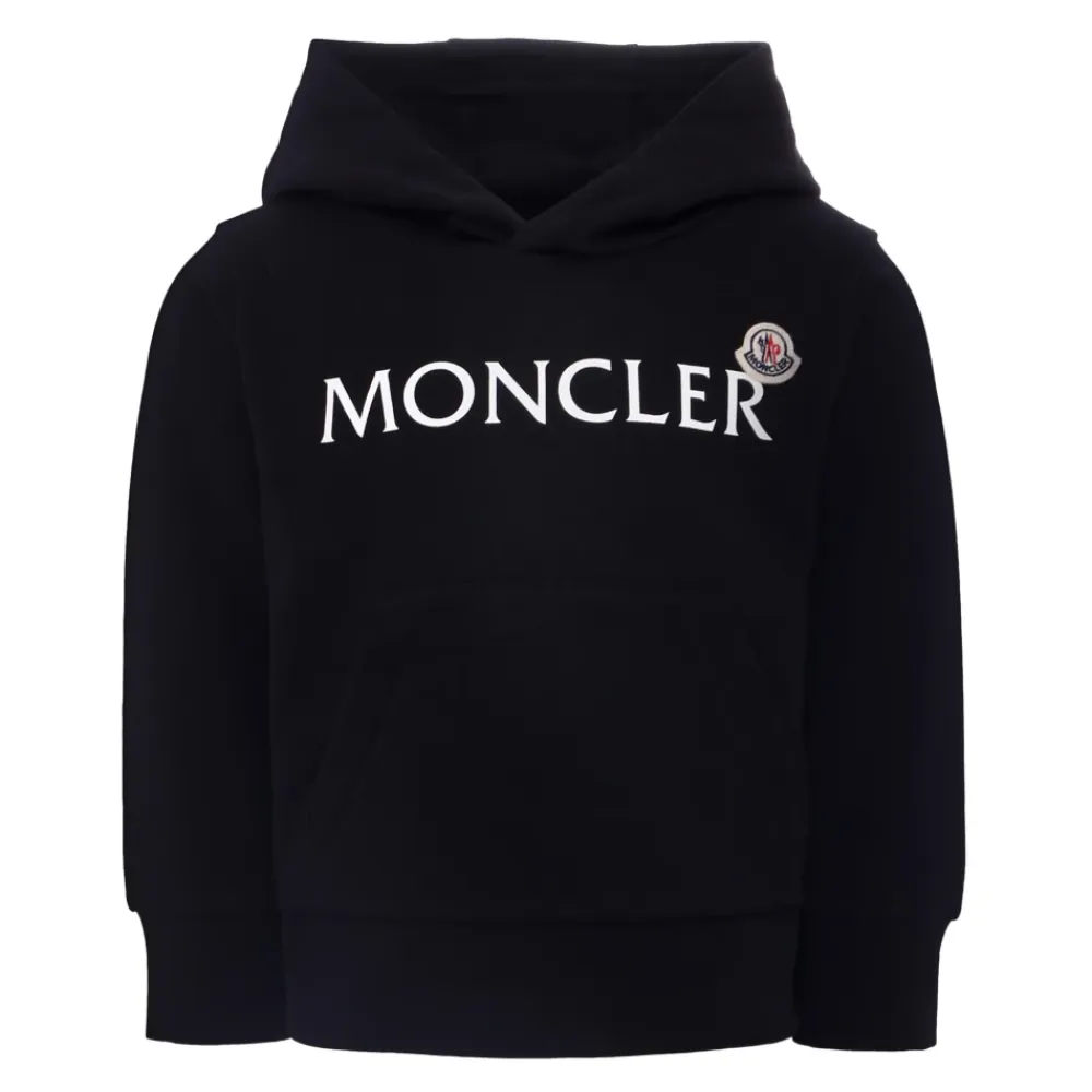 Kleiden Sie Ihr Kleines stilvoll mit diesem schwarzen Sweatshirt der Luxusmarke Moncler Kids. Hergestellt aus Fleece-Baumwolle, verfügt es über lange Ärmel, Kapuze, Fronttasche, gerippte Bündchen und Saum. Der Sweatshirt ist mit einem Logoaufdruck und einem ikonischen Logopatch auf der Vorderseite verziert. Aus 100% Baumwolle gefertigt, maschinenwaschbar bei 30°C.