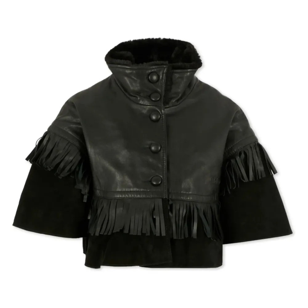 Heben Sie den Stil Ihres Kindes mit diesem Chloé schwarzen Ledercape hervor. Mit kurzen Ärmeln, einem hohen Kunstpelzkragen, einem vorderen Knopfverschluss und Fransen vorne und hinten. Verziert mit einem geprägten Logo auf der Vorderseite. Hergestellt aus 100% Leder.