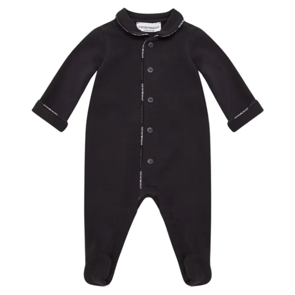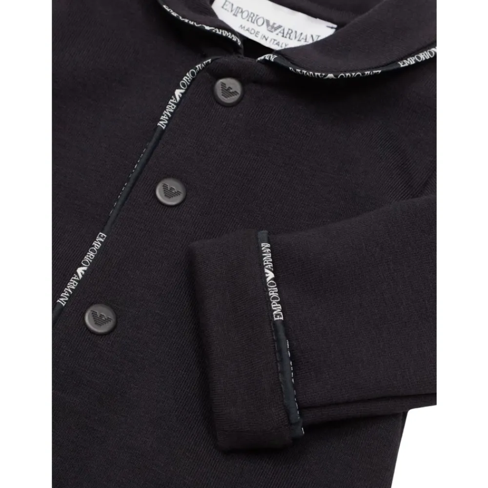 Emporio Armani Junior blauer Body aus reinem Stretch-Baumwolljersey, verziert mit kontrastierendem Logo-Saum, langen Ärmeln, Peter Pan-Kragen, vorderer und unterer Öffnung. Zusammensetzung: 93% Warme Baumwolle 7% Elastan. Hergestellt in Italien.
