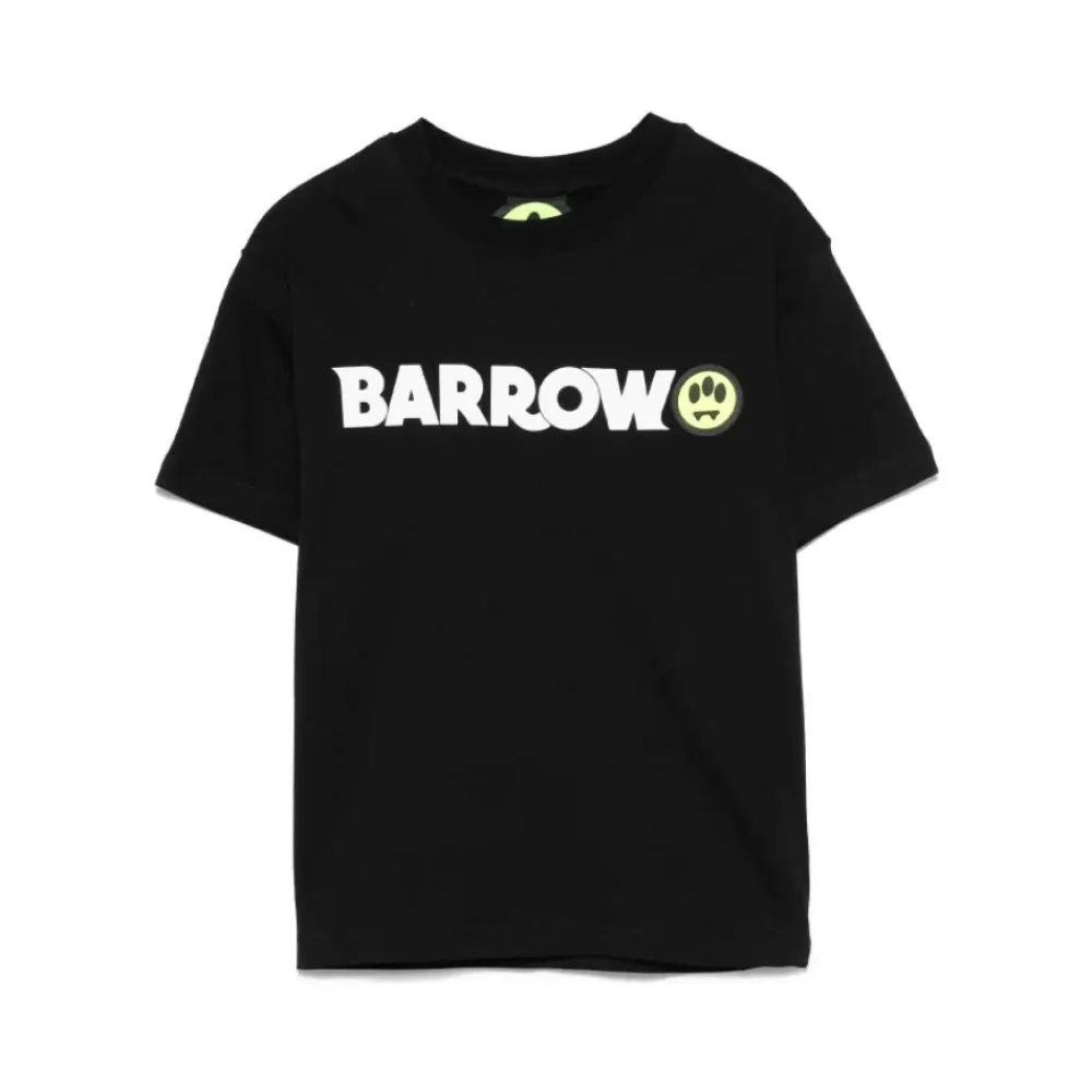 BARROW T-Shirt für Mädchen in Schwarz, aus weicher Baumwolle gefertigt. Mit dem ‚BARROW‘-Logo in Weiß und dem ikonischen Smiley in fluoreszierendem Gelb auf der Brust. Die reguläre Passform und das bequeme Tragen machen es perfekt für einen lässigen und stilvollen Look, ideal zu kombinieren mit Shorts oder Jeans für den Alltagsstil. Ein vielseitiges Kleidungsstück, geeignet für Kinder, Teenager und Frauen, bequem bis Größe 44. Die Frau trägt Größe 14 Jahre, das Mädchen trägt Größe 12 Jahre und der Junge trägt Größe 10 Jahre. Empfohlenes Waschen und Bügeln bei mittlerer Temperatur. Frühling Sommer Saison. Kurzarm schwarzes Damen Regular Fit T-Shirt für Frühling Sommer S5BKJUTH082110.