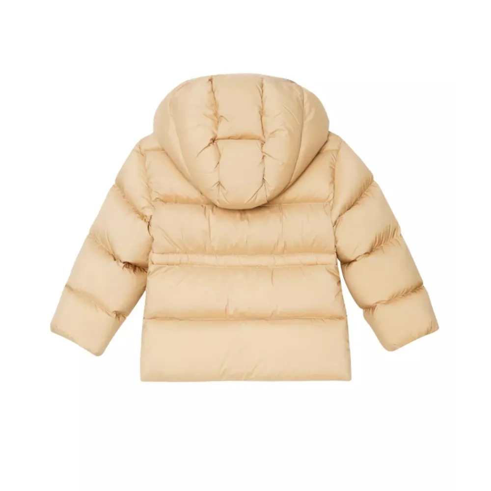 Bleiben Sie warm und stilvoll in diesem Winter mit dieser beigen Steppjacke von Moncler Kids. Hergestellt aus leichtem Stoff, verfügt diese Jacke über das Markenlogo-Patch am linken Ärmel, zwei Druckknopf-Fronttaschen, eine abnehmbare Kapuze und akribische Aufmerksamkeit für Details. Oberstoff: 100% Polyamid, Futter: 100% Polyamid, Füllung: 90% Daunen 10% Federn.