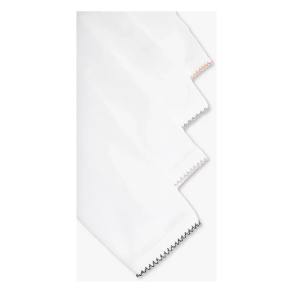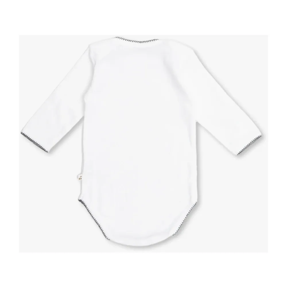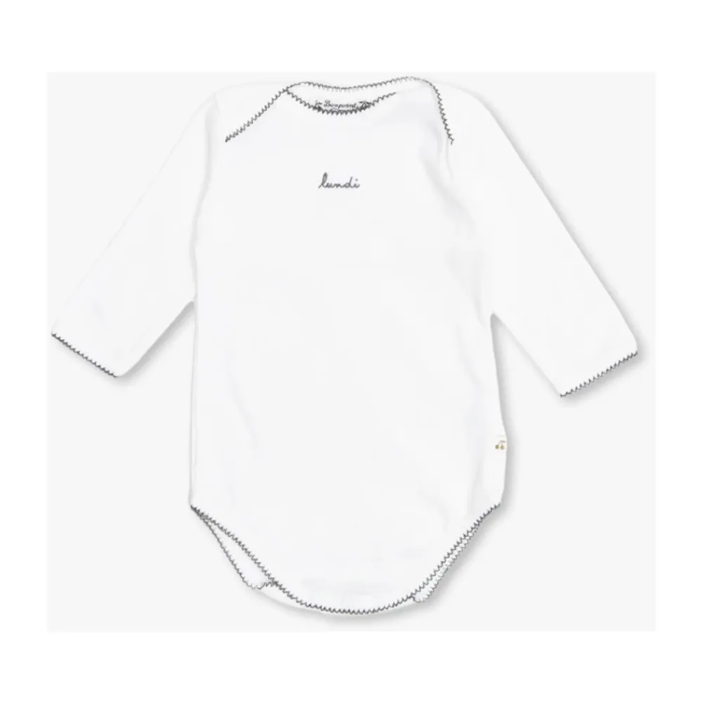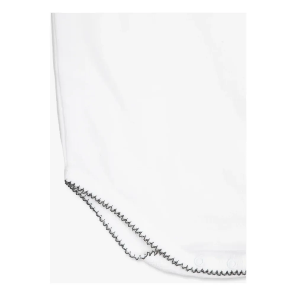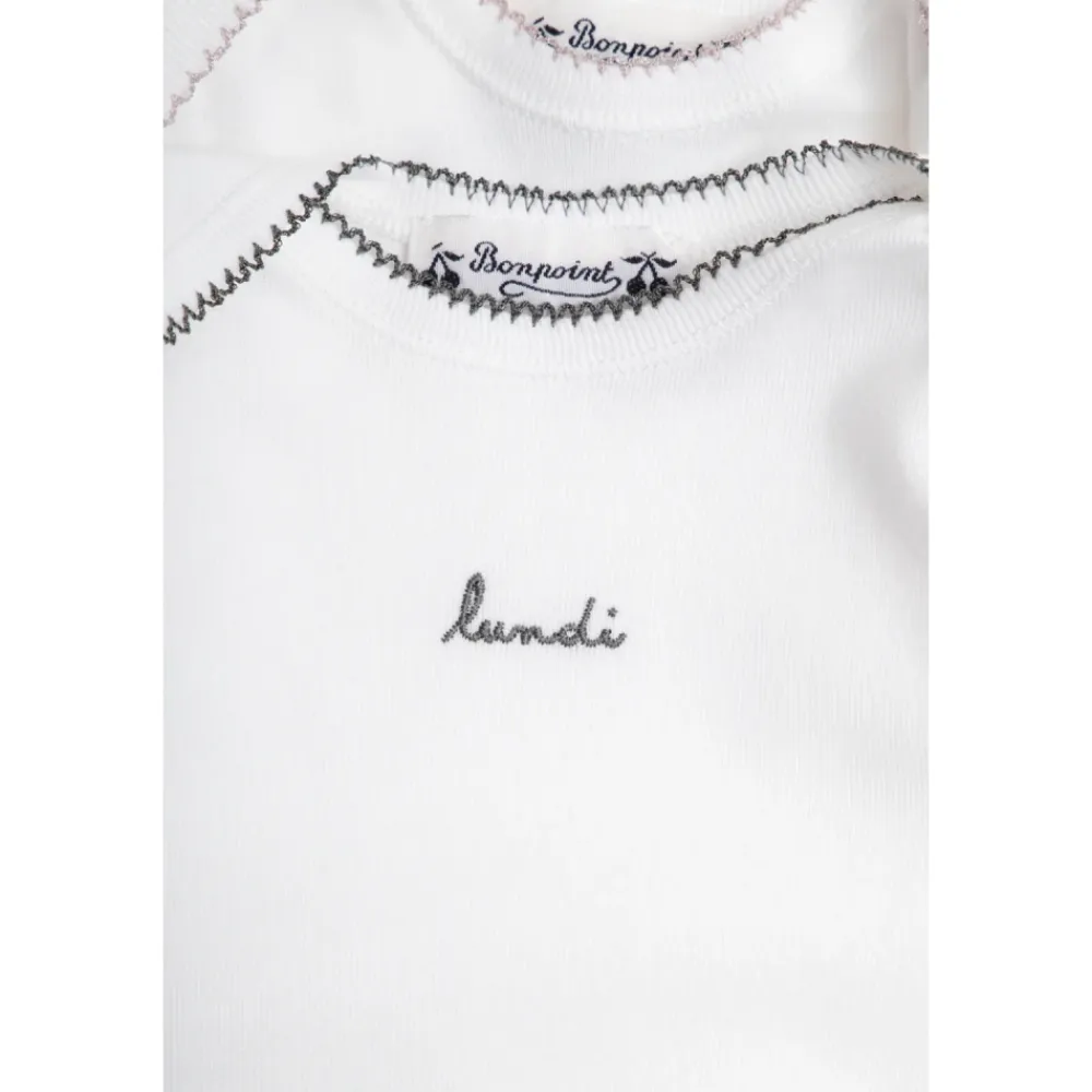 Geschenkset von Bonpoint. Es enthält einen weißen Baumwoll-Body 7er-Pack mit bestickten Wochentagen, Druckknopfverschlüssen, langen Ärmeln und kontrastierenden Borten, ein graubeiges Kaninchen-Maskottchen und eine markengeprägte Zahndose.