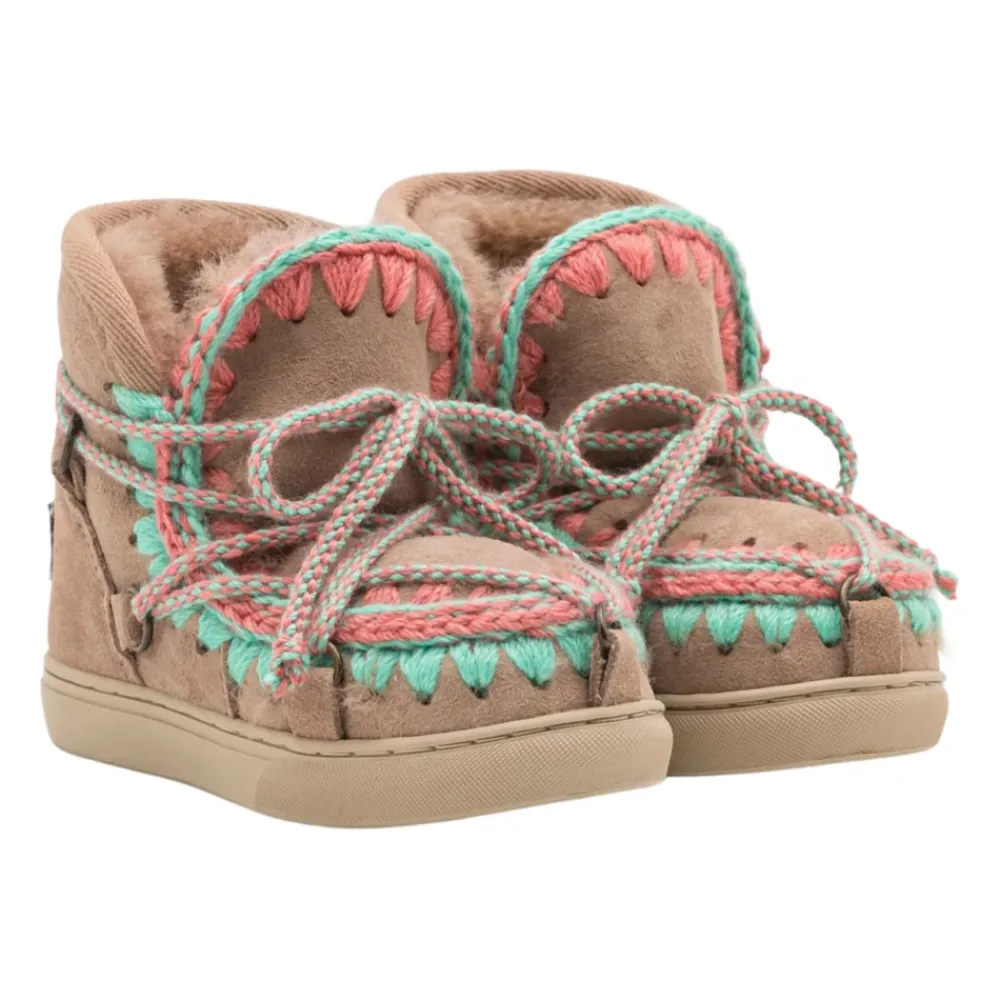 Mou Kids Eskimo beige Wildlederstiefel für Mädchen, handgefertigt aus 100% Wolle mit mehrfarbigen Häkelstichen, Scoubidou-Schnürsenkel, Logo-Patch auf der Rückseite, gepolsterte Wildleder-Innensohle, verstärkte Ferse, flexible Gummilaufsohle.