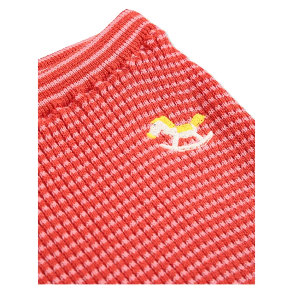 BOBO CHOSES HOSEN MIT VERSTECKTEN FÜSSEN begeistern durch ihre subtile Raffinesse und durchdachtes Design. Ihr zeitloser Schnitt, ergänzt durch einen elastischen Bund, gewährleistet vollständigen Komfort und eine perfekte Passform für die Silhouette Ihres Kindes, während das Stretchgestrick Bewegungsfreiheit garantiert, selbst während der fröhlichsten Spielzeit. DIE ROTE FARBE des Stoffes, verziert mit einem regelmäßigen weiß-roten Muster, zieht die Aufmerksamkeit auf sich, bleibt dabei aber eine elegante und raffinierte Wahl. Das Material, charakteristisch für exklusive Baumwolle mit einer hautfreundlichen Webart, garantiert Weichheit und Sicherheit für die empfindlichste Babyhaut. Ein einzigartiges Detail ist das bestickte ROCKING HORSE MOTIV, exquisit betont auf der oberen linken Seite, und dient als wiedererkennbares Symbol der Marke Bobo Choses. Diese Hosen verkörpern perfekt die Philosophie des Designers – eine Feier der Kreativität und einer sorglosen Kindheit. WARUM LOHNT ES SICH, DIESES PRODUKT ZU KAUFEN? * Außergewöhnliches Muster und Finish, die die Exklusivität der Marke widerspiegeln * Natürliche, weiche Baumwolle, sanft zur empfindlichen Haut Ihres Kindes * Flexibler Schnitt mit einem bequemen Bund für eine perfekte Passform * Einzigartige Stickerei eines Schaukelpferds, die die Originalität des Designs hervorhebt * Sorgfältige Handwerkskunst, die Komfort und Langlebigkeit gewährleistet